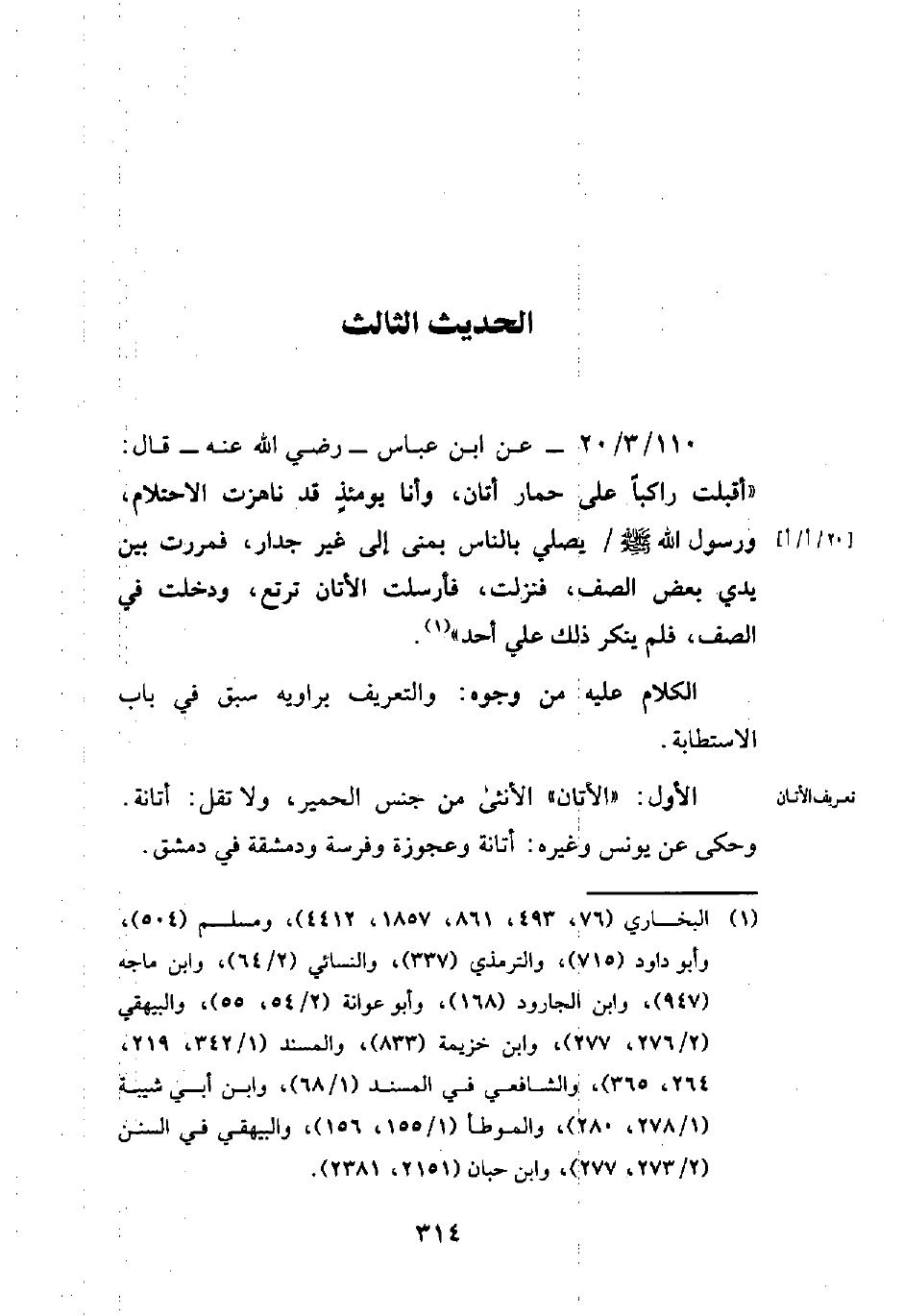 110/ 3/ 20 - عن ابن عباس - رضي الله عنه - قال: "أقبلت راكبًا على حمار أتان، وأنا يومئذٍ قد ناهزت الاحتلام، ورسول الله - صلى الله عليه وسلم - يصلي بالناس بمنى إلى غير جدار، فمررت بين يدي بعض الصف، فنزلت، فأرسلت الأتان ترتع، ودخلت في الصف، فلم ينكر ذلك علي أحد" (¬1).