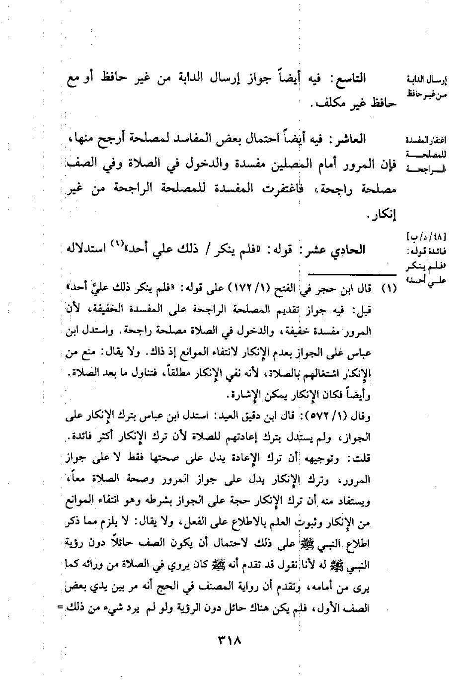 (¬1) قال ابن حجر في الفتح (1/ 172) على قوله: "فلم ينكر ذلك عليَّ أحد" قيل: فيه جواز تقديم المصلحة الراجحة على المفسدة الخفيفة، لأن المرور مفسدة خفيفة، والدخول في الصلاة مصلحة راجحة. واستدل ابن عباس على الجواز بعدم الإِنكار لانتفاء المرافع إذ ذاك. ولا يقال: منع من الإِنكار اشتغالهم بالصلاة، لأنه نفي الإِنكار مطلقًا، فتناول ما بعد الصلاة. وأيضًا فكان الإِنكار يمكن الإِشارة.