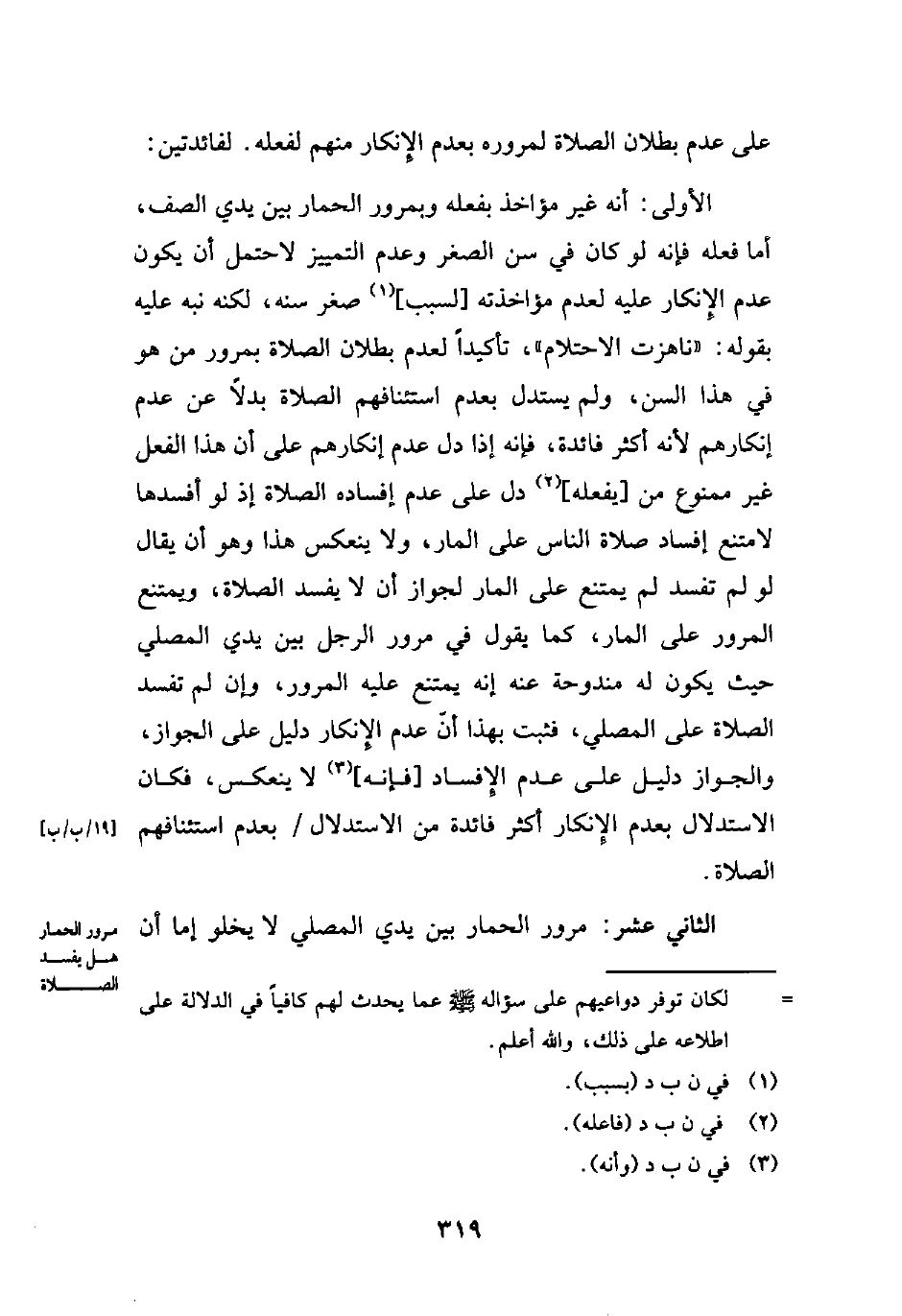الأولى: أنه غير مؤاخذ بفعله وبمرور الحمار بين يدي الصف، أما فعله فإنه لو كان في سن الصغر وعدم التمييز لاحتمل أن يكون عدم الإِنكار عليه لعدم مؤاخذته [لسبب] (¬1) صغر سنه، لكنه نبه عليه بقوله: "ناهزت الاحتلام"، تأكيدًا لعدم بطلان الصلاة بمرور من هو في هذا السن، ولم يستدل بعدم استئنافهم الصلاة بدلًا عن عدم إنكارهم لأنه أكثر فائدة، فأنه إذا دل عدم إنكارهم على أن هذا الفعل غير ممنوع من [يفعله] (¬2) دل على عدم إفساده الصلاة إذ لو أفسدها لامتنع إفساد صلاة الناس على المار، ولا ينعكس هذا وهو أن يقال لو لم تفسد لم يمتنع على المار لجواز أن لا يفسد الصلاة، ويمتنع المرور على المار، كما يقول في مرور الرجل بين يدي المصلي حيث يكون له مندوحة عنه إنه يمتنع عليه المرور، وإن لم تفسد الصلاة على المصلي، فثبت بهذا أن عدم الإِنكار دليل على الجواز، والجواز دليل على عدم الإِفساد [فإنه] (¬3) لا ينعكس، فكان الاستدلال بعدم الإِنكار أكثر فائدة من الاستدلال بعدم استئنافهم الصلاة.