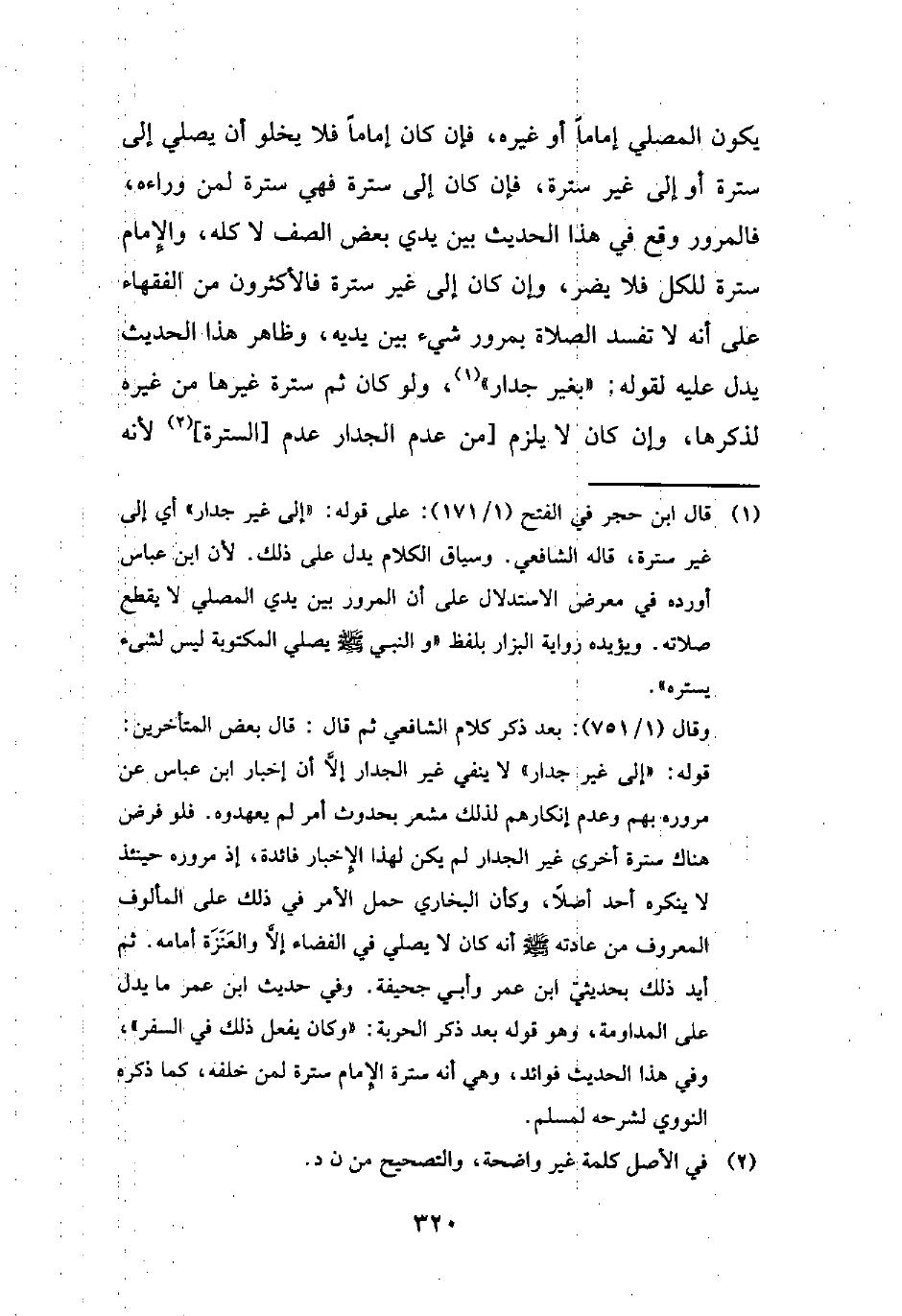 وقال (1/ 751): بعد ذكر كلام الشافعي ثم قال، قال بعض المتأخرين: قوله: "إلى غير جدار" لا ينفي غير الجدار إلَّا أن إخبار ابن عباس عن مروره بهم وعدم إنكارهم لذلك مشعر بحدوث أمر لم يعهدوه. فلو فرض هناك سترة أخرى غير الجدار لم يكن لهذا الإِخبار فائدة، إذ مروره حينئذ لا ينكره أحد أصلًا، وكأن البخاري حمل الأمر في ذلك على المألوف المعروف من عادته - صلى الله عليه وسلم - أنه كان لا يصلي في الفضاء إلَّا والعَنَزَة أمامه. ثم أيد ذلك بحديثي ابن عمر وأبي جحيفة. وفي حديث ابن عمر ما يدل على المداومة، وهو قوله بعد ذكر الحربة: "وكان يفعل ذلك في السفر"، وفي هذا الحديث فوائد، وهي أنه سترة الإِمام سترة لمن خلفه، كما ذكره النووي لشرحه لمسلم.