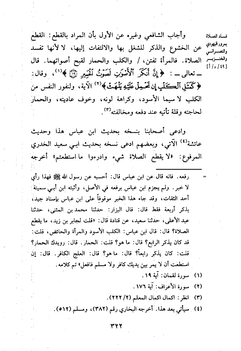 وأجاب الشافعي وغيره عن الأول بأن المراد بالقطع. القطع عن الخشوع والذكر للشغل بها والالتفات إليها، لا لأنها تفسد الصلاة. فالمرأة تفتن، والكلب والحمار لقبح أصواتهما. قال -تعالى-: {إِنَّ أَنْكَرَ الْأَصْوَاتِ لَصَوْتُ الْحَمِيرِ (19)} (¬1)، وقال: {كَمَثَلِ الْكَلْبِ إِنْ تَحْمِلْ عَلَيْهِ يَلْهَثْ} (¬2) الآية، ولنفور النفس من الكلب لا سيما الأسود، وكراهة لونه، وخوف عاديته، والحمار لحاجته وقلة تأتيه عند دفعه ومخالفته (¬3).