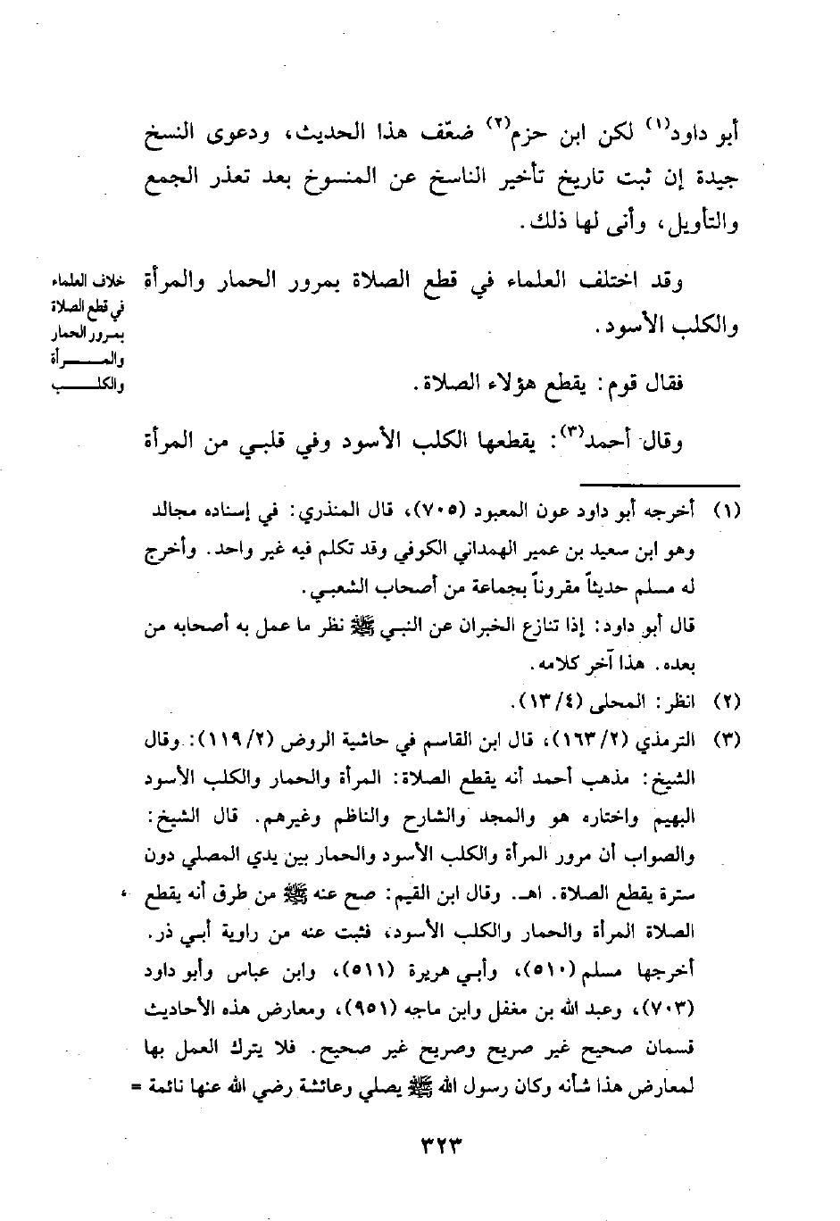 (¬3) الترمذي (2/ 163)، قال ابن القاسم في حاشية الروض (2/ 119): وقال الشيخ: مذهب أحمد أنه يقطع الصلاة: المرأة والحمار والكلب الأسود البهيم واختاره هو والمجد والشارح والناظم وغيرهم. قال الشيخ: والصواب أن مرور المرأة والكللب الأسود والحمار بين يدي المصلي دون سترة يقطع الصلاة. اهـ. وقال ابن القيم: صح عنه - صلى الله عليه وسلم - من طرق أنه يقطع الصلاة المرأة والحمار والكلب الأسود، ثبت عنه من راوية أبي ذر. أخرجها مسلم (510)، وأبي هريرة (511)، وابن عباس وأبو داود (703)، وعبد الله بن مغفل وابن ماجه (951)، ومعارض هذه الأحاديث قسمان صحيح غير صريح وصريح غير صحيح. فلا يترك العمل بها لمعارض هذا شأنه وكان رسول الله - صلى الله عليه وسلم - يصلي وعائشة رضي الله عنها نائمة =