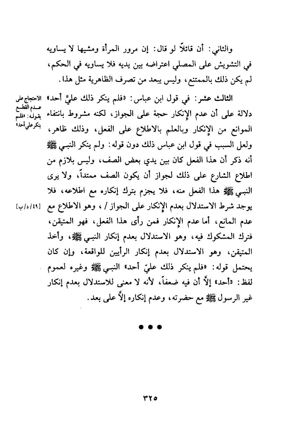 الثالث عشر: في قول ابن عباس: "فلم ينكر ذلك علي أحد" دلالة على أن عدم الإِنكار حجة على الجواز، لكنه مشروط بانتفاء الموانع من الإِنكار وبالعلم بالاطلاع على الفعل، وذلك ظاهر، ولعل السبب في قول ابن عباس ذلك دون قوله: ولم ينكر النبي - صلى الله عليه وسلم - أنه ذكر أن هذا الفعل كان بين يدي بعض الصف، وليس بلازم من اطلاع الشارع على ذلك لجواز أن يكون الصف ممتدًا، ولا يرى النبي - صلى الله عليه وسلم - هذا الفعل مته، فلا يجزم بترك إنكاره مع اطلاعه، فلا يوجد شرط الاستدلال بعدم الإِنكار على الجواز، وهو الاطلاع مع عدم المانع أما عدم الإِنكار فمن رأى هذا الفعل، فهو المتيقن، فترك المشكوك فيه، وهو الاستدلال بعدم إنكار النبي - صلى الله عليه وسلم -، وأخذ المتيقن، وهو الاستدلال بعدم إنكار الرأيين للواقعة، وإن كان يحتمل قوله: "فلم ينكر ذلك عليّ أحد" النبي - صلى الله عليه وسلم - وغيره لعموم لفظ: "أحد" إلَّا أن فيه ضعفًا، لأنه لا معنى للاستدلال بعدم إنكار غير الرسول - صلى الله عليه وسلم - مع حضرته، وعدم إنكاره إلَّا على بعد.
