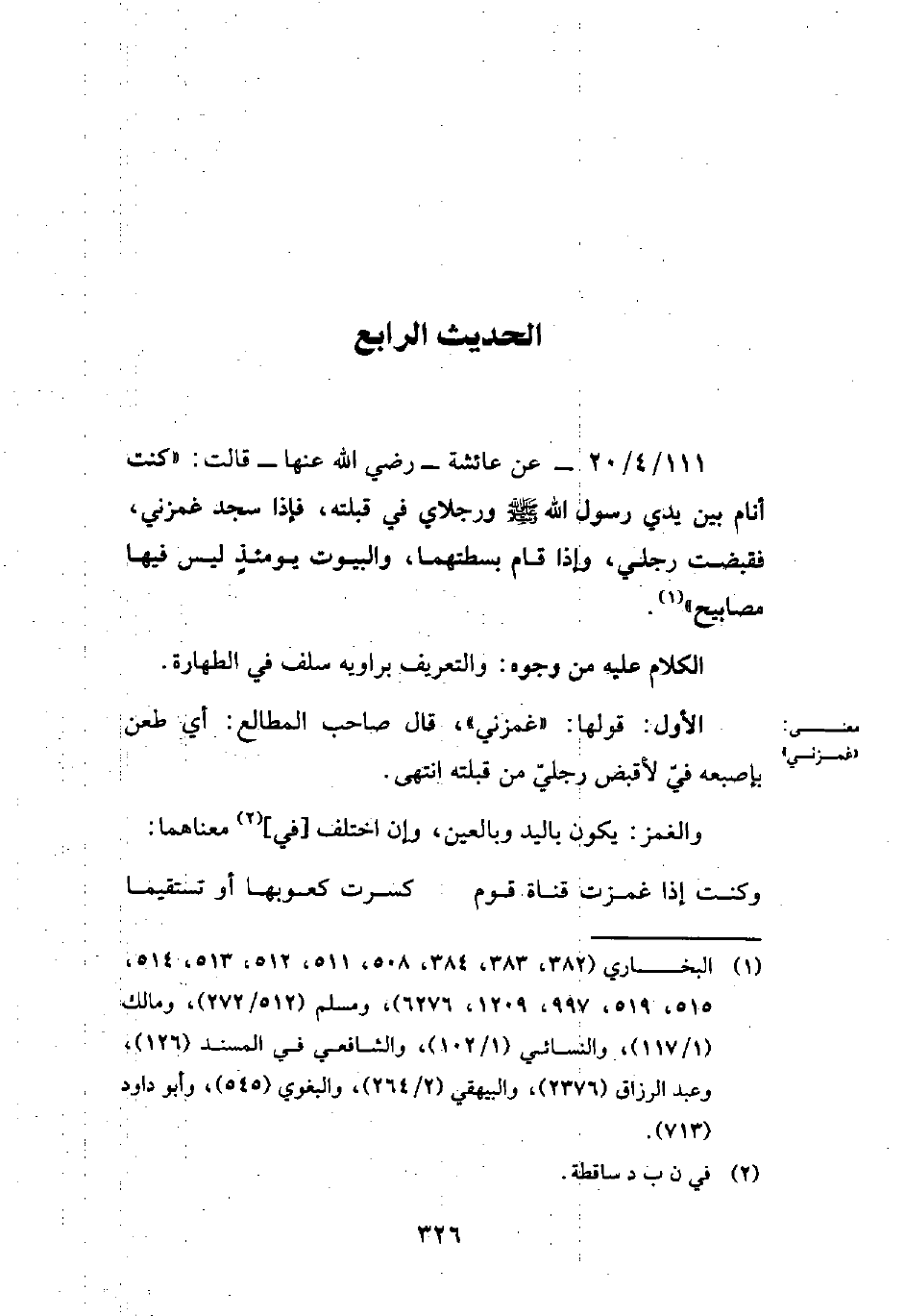 111/ 4/ 20 - عن عائشة - رضي الله عنها - قالت: "كنت أنام بين يدي رسول الله - صلى الله عليه وسلم - ورجلاي في قبلته، فإذا سجد غمزني، فقبضت رجلي، وإذا قام بسطتهما، والبيوت يومئذٍ ليس فيها مصابيح" (¬1).