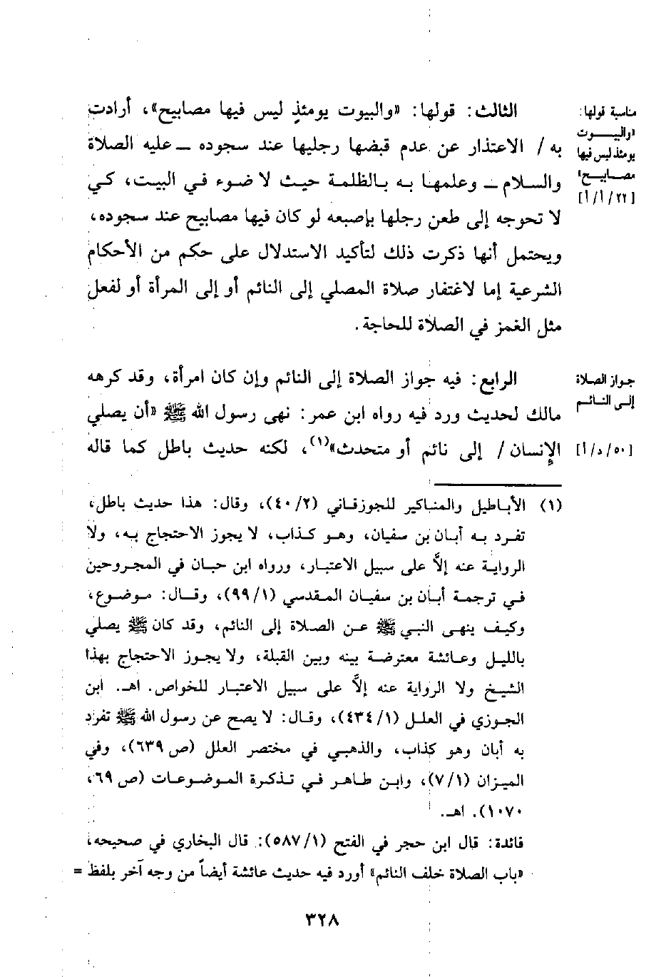 (¬1) الأباطيل والمناكير للجوزقاني (2/ 40)، وقال: هذا حديث باطل، تفرد به أبان بن سفيان، وهو كذاب، لا يجوز الاحتجاج به، ولا الرواية عنه إلَّا على سبيل الاعتبار، ورواه ابن حبان في المجروحين في ترجمة أبان بن سفيان المقدسي (1/ 99)، وقال: موضوع، وكيف ينهى النبي - صلى الله عليه وسلم - عن الصلاة إلى النائم، وقد كان - صلى الله عليه وسلم - يصلي بالليل وعائشة معترضة بينه وبين القبلة، ولا يجوز الاحتجاج بهذا الشيخ ولا الرواية عنه إلَّا على سبيل الاعتبار للخواص. اهـ. ابن الجوزي في العلل (1/ 434)، وقال: لا يصح عن رسول الله - صلى الله عليه وسلم - تفرد به أبان وهو كذاب، والذهبي في مختصر العلل (ص 639)، وفي الميزان (1/ 7)، وابن طاهر في تذكرة الموضوعات (ص 69، 1070). اهـ.