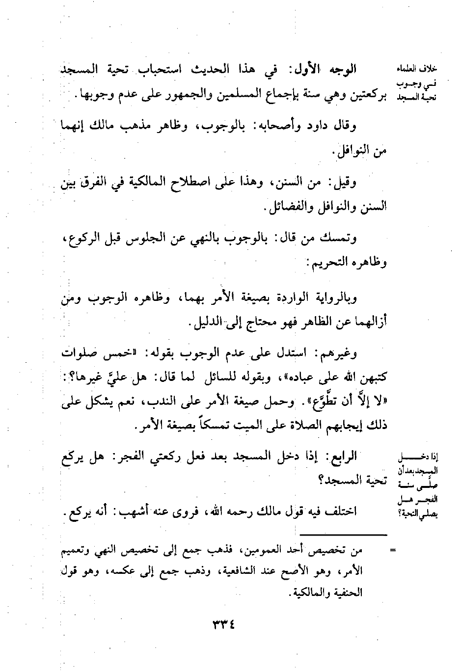 الوجه الأول: في هذا الحديث استحباب تحية المسجد بركعتين وهي سنة بإجماع المسلمين والجمهور على عدم وجوبها.