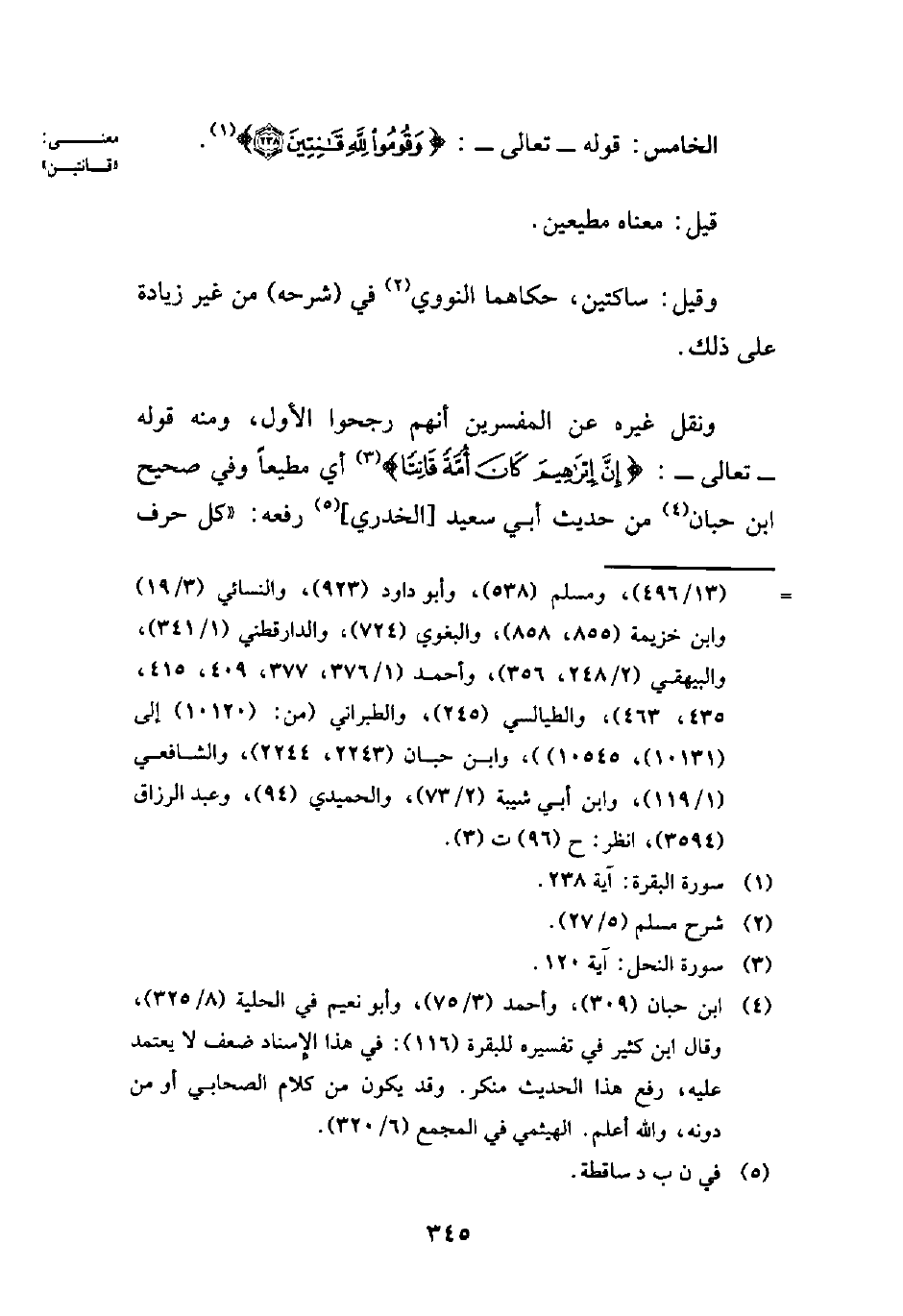ونقل غيره عن المفسرين أنهم رجحوا الأول، ومنه قوله -تعالى-: {إِنَّ إِبْرَاهِيمَ كَانَ أُمَّةً قَانِتًا} (¬3) أي مطيعًا وفي صحيح ابن حبان (¬4) من حديث أبي سعيد [الخدري] (¬5) رفعه: "كل حرف