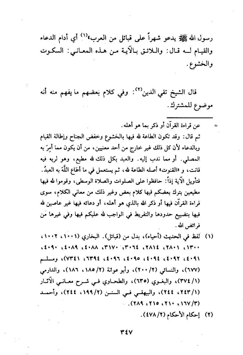رسول الله - صلى الله عليه وسلم - يدعو شهرًا على قبائل من العرب" (¬1) أي أدام الدعاء والقيام له قال: واللائق بالآية من هذه المعاني: السكوت والخشوع.
