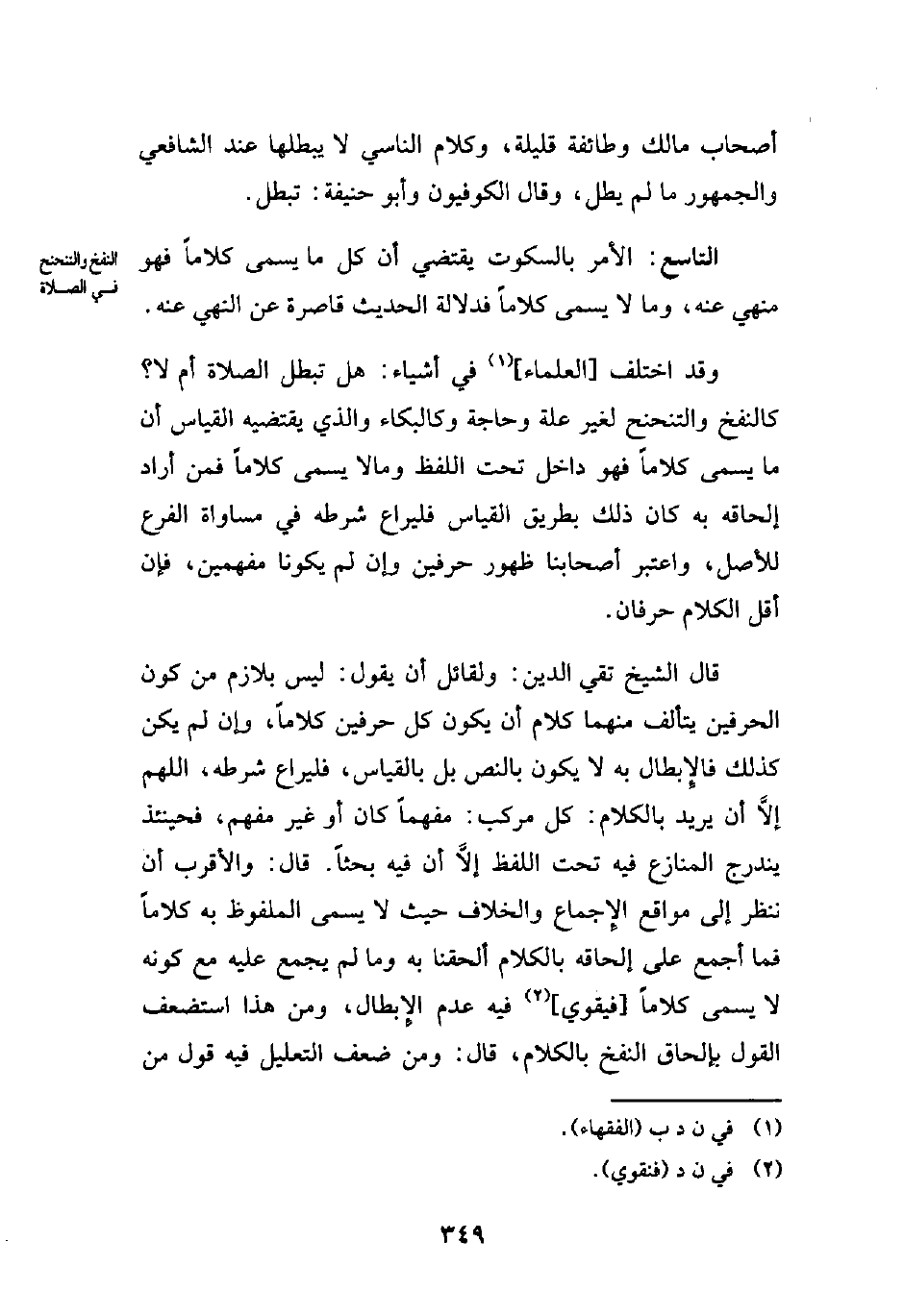 قال الشيخ تقي الدين: ولقائل أن يقول: ليس بلازم من كون الحرفين يتألف منهما كلام أن يكون كل حرفين كلامًا، وإن لم يكن كذلك فالإِبطال به لا يكون بالنص بل بالقياس، فليراع شرطه، اللهم إلَّا أن يريد بالكلام: كل مركب: مفهمًا كان أو غير مفهم، فحينئذٍ يندرج المنازع فيه تحت اللفظ إلَّا أن فيه بحثًا. قال: والأقرب أن ننظر إلى مواقع الإِجماع والخلاف حيث لا يسمى الملفوظ به كلامًا فما أجمع على إلحاقه بالكلام ألحقنا به وما لم يجمع عليه مع كونه لا يسمى كلامًا [فيقوي] (¬2) فيه عدم الإِبطال، ومن هذا استضعف القول بإلحاق النفخ بالكلام، قال: ومن ضعف التعليل فيه قول من
