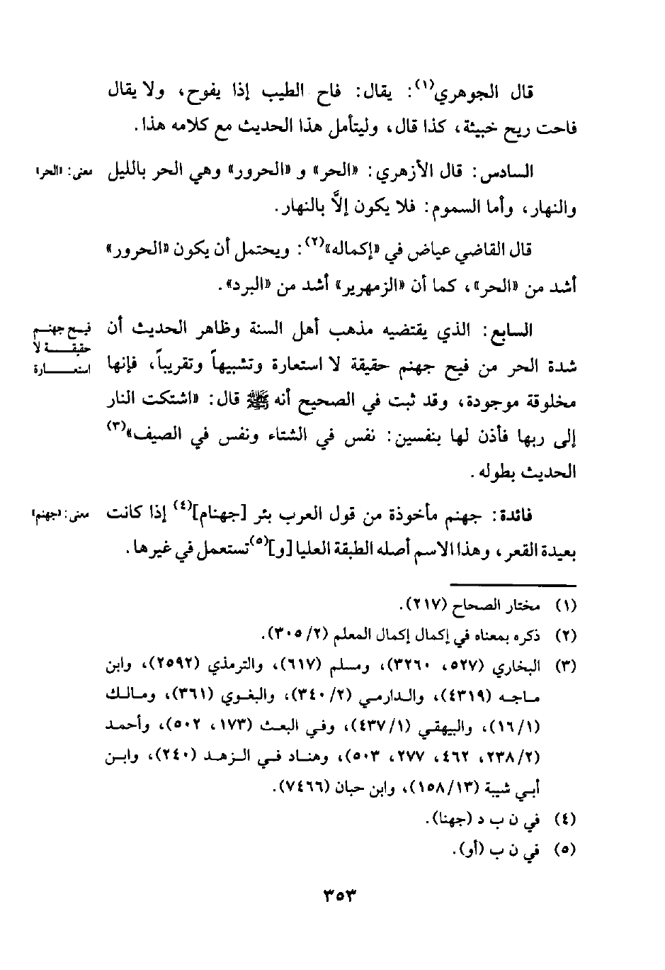 السادس: قال الأزهري: "الحر" و"الحرور" وهي الحر بالليل والنهار، وأما السموم: فلا يكون إلَّا بالنهار.