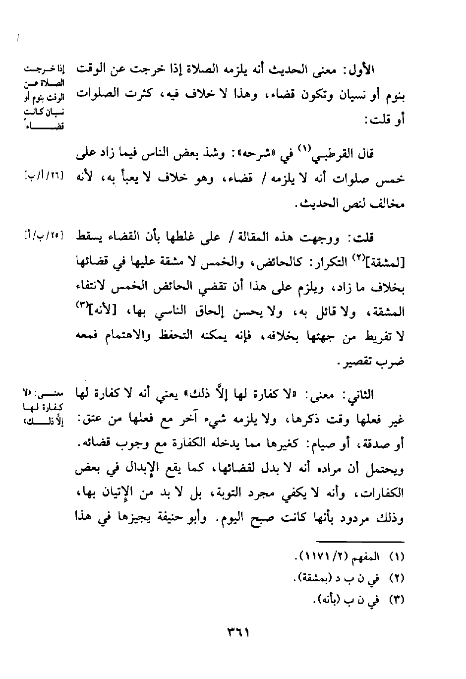 الأول: معنى الحديث أنه يلزمه الصلاة إذا خرجت عن الوقت بنوم أو نسيان وتكون قضاء، وهذا لا خلاف فيه، كثرت الصلوات