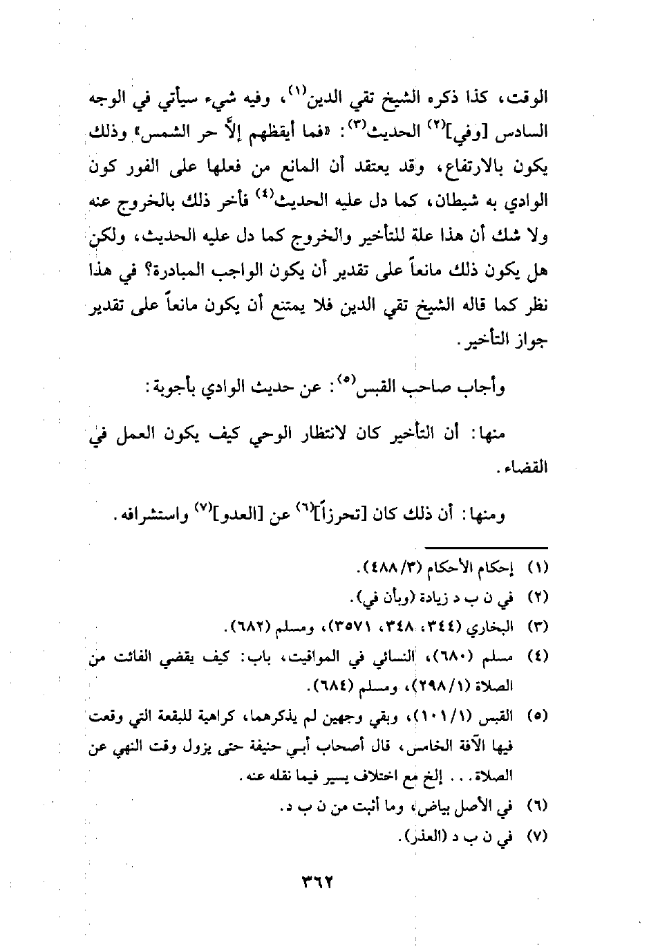 الوقت، كذا ذكره الشيخ تقي الدين (¬1)، وفيه شيء سيأتي في الوجه السادس [وفي] (¬2) الحديث (¬3): "فما أيقظهم إلَّا حر الشمس" وذلك يكون بالارتفاع، وقد يعتقد أن المانع من فعلها على الفور كون الوادي به شيطان، كما دل عليه الحديث (¬4) فأخر ذلك بالخروج عنه ولا شك أن هذا علة للتأخير والخروج كما دل عليه الحديث، ولكن هل يكون ذلك مانعًا على تقدير أن يكون الواجب المبادرة؟ في هذا نظر كما قاله الشيخ تقي الدين فلا يمتنع أن يكون مانعًا على تقدير جواز التأخير.