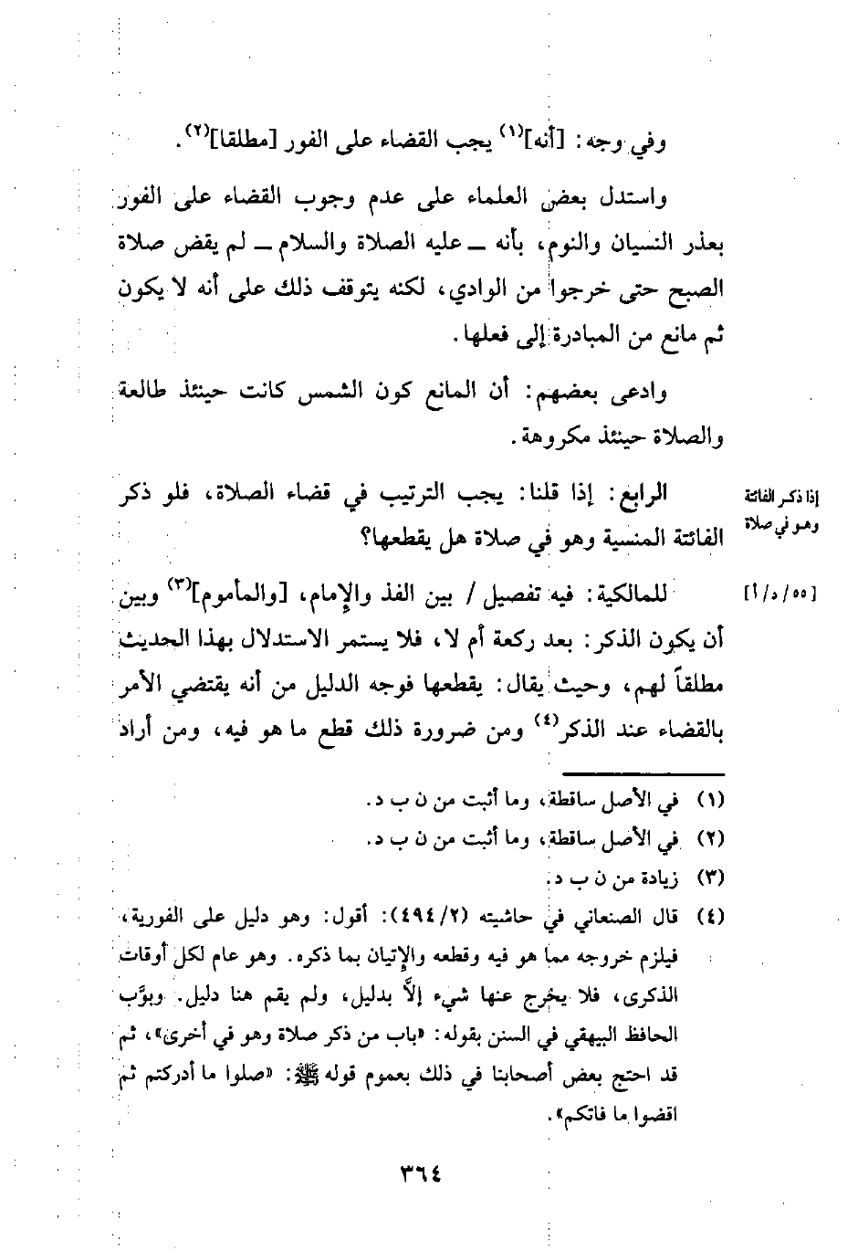 (¬4) قال الصنعاني في حاشيته (2/ 494): أقول: وهو دليل على الفورية، فيلزم خروجه مما هو فيه وقطعه والإِتيان بما ذكره. وهو عام لكل أوقات الذكرى، فلا يخرج عنها شيء إلَّا بدليل، ولم يقم هنا دليل. وبوَّب الحافظ البيهقي في السنن بقوله: "باب من ذكر صلاة وهو في أخرى"، ثم قد احتج بعض أصحابنا في ذلك بعموم قوله - صلى الله عليه وسلم -: "صلوا ما أدركتم ثم اقضوا ما فاتكم".