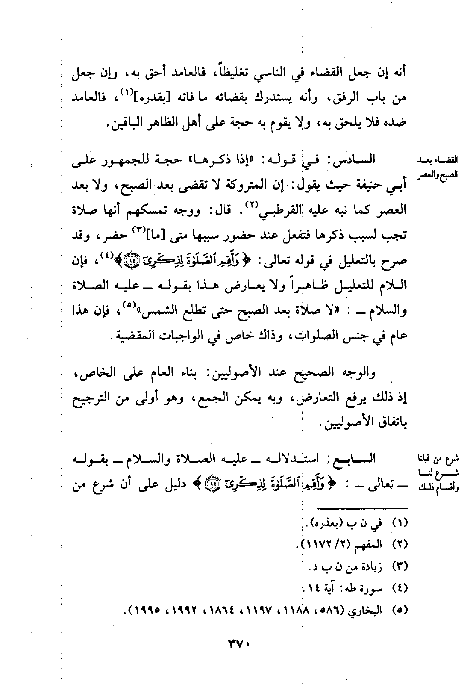 السادس: في قوله: "إذا ذكرها" حجة للجمهور على أبي حنيفة حيث يقول: إن المتروكة لا تقضي بعد الصبح، ولا بعد العصر كما نبه عليه القرطبي (¬2). قال: ووجه تمسكهم أنها صلاة تجب لسبب ذكرها فتفعل عند حضور سببها متى [ما] (¬3) حضر، وقد صرح بالتعليل في قوله تعالى: {وَأَقِمِ الصَّلَاةَ لِذِكْرِي (14)} (¬4)، فإن اللام للتعليل ظاهرًا ولا يعارض هذا بقوله - عليه الصلاة والسلام -: "لا صلاة بعد الصبح حتى تطلع الشمس" (¬5)، فإن هذا عام في جنس الصلوات، وذاك خاص في الواجبات المقضية.