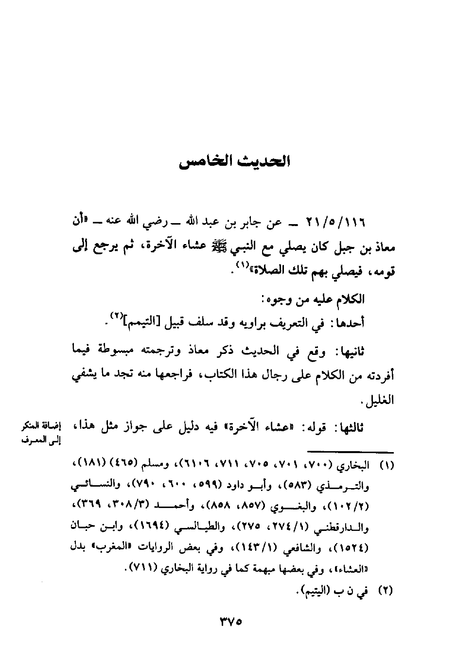 (¬1) البخاري (700، 701، 705، 711، 6160)، ومسلم (465) (181)، والترمذي (583)، وأبو داود (599، 600، 790)، والنسائي (2/ 102)، والبغوي (857، 858)، وأحمد (3/ 308، 369)، والدارقطني (1/ 274، 275)، والطيالسي (1694)، وابن حبان (1524)، والشافعي (1/ 143)، وفي بعض الروايات "المغرب" بدل "العشاء"، وفي بعضها مبهمة كما في رواية البخاري (711).