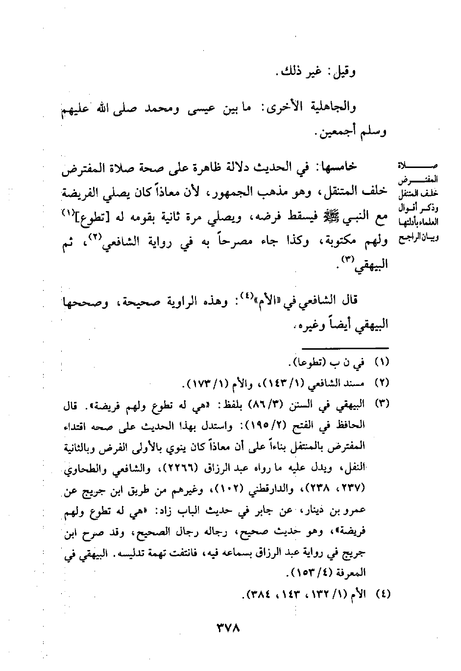 (¬3) البيهقي في السنن (3/ 86) بلفظ: "هي له تطوع ولهم فريضة". قال الحافظ في الفتح (2/ 195): واستدل بهذا الحديث على صحه اقتداء المفترض بالمنتفل بناءًا على أن معاذًا كان ينوي بالأولى الفرض وبالثانية النفل، ويدل عليه ما رواه عبد الرزاق (2266)، والشافعي والطحاوي (237، 238)، والدارقطني (102)، وغيرهم من طريق ابن جريج عن عمرو بن دينار، عن جابر في حديث الباب زاد: "هي له تطوع ولهم فريضة"، وهو حديث صحيح، رجاله رجال الصحيح، وقد صرح ابن جريج في رواية عبد الرزاق بسماعه فيه، فانتفت تهمة تدليسه. البيهقي في المعرفة (4/ 153).