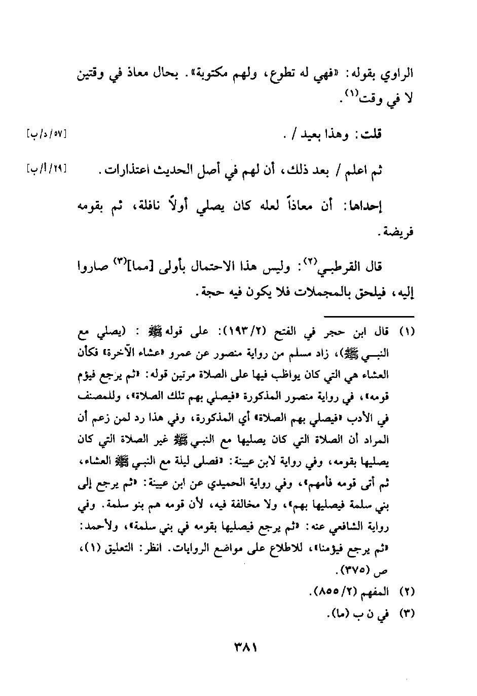 (¬1) قال ابن حجر في الفتح (2/ 193): على قوله - صلى الله عليه وسلم -: (يصلي مع النبي - صلى الله عليه وسلم -)، زاد مسلم من رواية منصور عن عمرو "عشاء الآخرة" فكأن العشاء هي التي كان يواظب فيها على الصلاة مرتين قوله: "ثم يرجع فيؤم قومه"، في رواية منصور المذكورة "فيصلي بهم تلك الصلاة"، وللمصنف في الأدب "فيصلي بهم الصلاة" أي المذكورة، وفي هذا رد لمن زعم أن المراد أن الصلاة التي كان يصليها مع النبي - صلى الله عليه وسلم - غير الصلاة التي كان يصليها بقومه، وفي رواية لابن عيينة: "فصلى ليلة مع النبي - صلى الله عليه وسلم - العشاء، ثم أتى قومه فأمهم"، وفي رواية الحميدي عن ابن عيينة: "ثم يرجع إلى بني سلمة فيصليها بهم"، ولا مخالفة فيه، لأن قومه هم بنو سلمة. وفي رواية الشافعي عنه: "ثم يرجع فيصليها بقومه في بني سلمة"، ولأحمد: "ثم يرجع فيؤمنا"، للاطلاع على مواضع الروايات. انظر: التعليق (1)، ص (375).