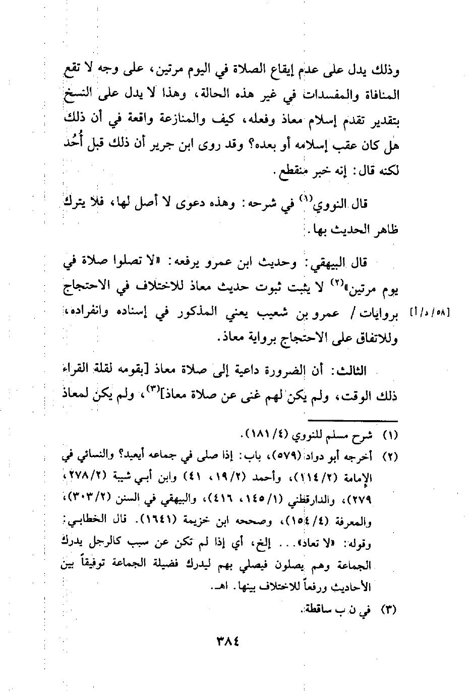 وذلك يدل على عدم إيقاع الصلاة في اليوم مرتين، على وجه لا تقع المنافاة والمفسدات في غير هذه الحالة، وهذا لا يدل على النسخ بتقدير تقدم إسلام معاذ وفعله، كيف والمنازعة واقعة في أن ذلك هل كان عقب إسلامه أو بعده؟ وقد روى ابن جرير أن ذلك قبل أُحُد لكنه قال: إنه خبر منقطع.