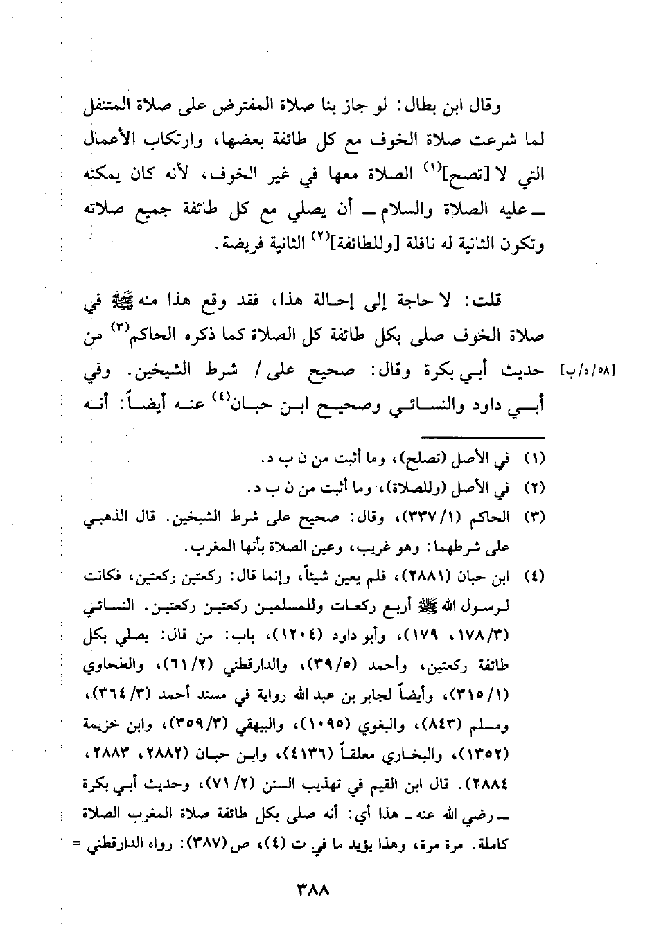 (¬4) ابن حبان (2881)، فلم يعين شيئًا، وإنما قال: ركعتين ركعتين، فكانت لرسول الله - صلى الله عليه وسلم - أربع ركعات وللمسلمين ركعتين ركعتين. النسائي (3/ 178، 179)، وأبو داود (1204)، باب: من قال: يصلي بكل طائفة ركعتين، وأحمد (5/ 39)، والدارقطني (2/ 61)، والطحاوي (1/ 315)، وأيضًا لجابر بن عبد الله رواية في مسند أحمد (3/ 364)، ومسلم (843)، والبغوي (1095)، والبيهقي (3/ 359)، وابن خزيمة (1352)، والبخاري معلقًا (4136)، وابن حبان (2882، 2883، 2884). قال ابن القيم في تهذيب السنن (2/ 71)، وحديث أبي بكرة - رضي الله عنه - هذا أي: أنه صلى بكل طائفة صلاة المغرب الصلاة كاملة. مرة مرة، وهذا يؤيد ما في ت (4)، ص (387): رواه الدارقطني =