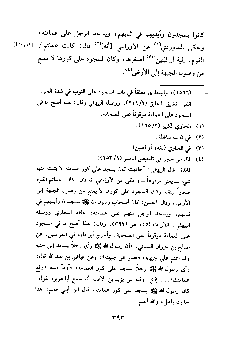 فائدة: قال البيهقي: أحاديث كان يسجد على كور عمامته لا يثبت منها شيء -يعني مرفوعًا- وحكى عن الأوزاعي أنه قال: كانت عمائم القوم صغارًا لينة، وكان السجود على كورها لا يمنع من وصول الجبهة إلى الأرض، وقال الحسن: كان أصحاب رسول الله - صلى الله عليه وسلم - يسجدون وأيديهم في ثيابهم، ويسجد الرجل منهم على عمامته، علقه البخاري ووصله البيهقي. انظر ت (5)، ص (392)، وقال: هذا أصح ما في السجود على العمامة موقوفًا على الصحابة. وأخرج أبو داود في المراسيل، عن صالح بن حيوان السبائي، "أن رسول الله - صلى الله عليه وسلم - رأى رجلًا يسجد إلى جنبه وقد اعتم على جبهته، فحسر عن جبهته"، وعن عياض بن عبد الله قال: رأى رسول الله - صلى الله عليه وسلم - رجلًا يسجد على كور العمامة، فأومأ بيده "ارفع عمامتك" ... إلخ. وفيه عن يزيد بن الأصم أنه سمع أبا هريرة يقول: كان رسول الله - صلى الله عليه وسلم - يسجد على كور عمامته، قال ابن أبي حاتم: هذا حديث باطل، والله أعلم.