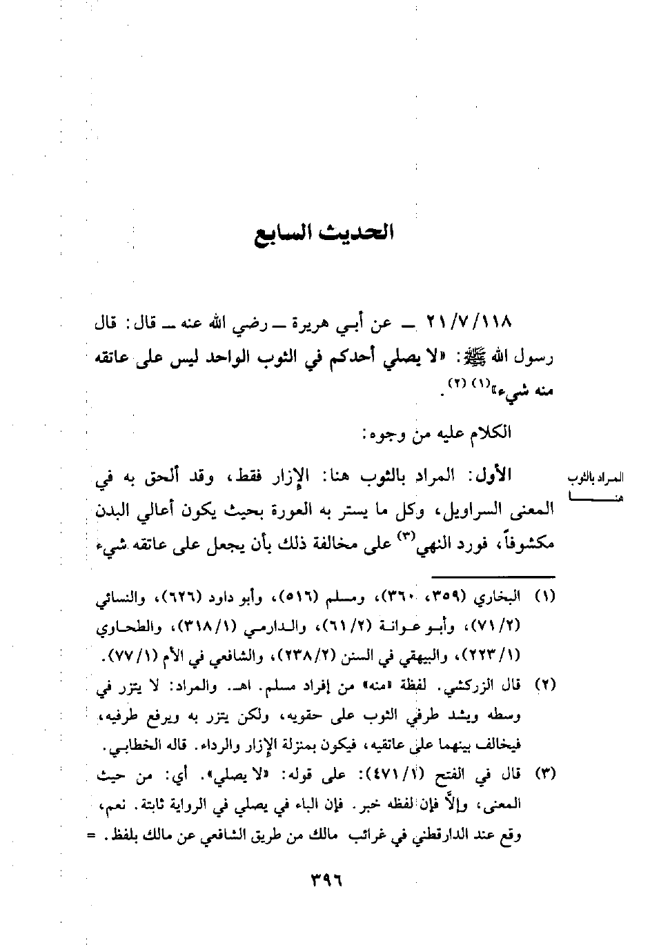 118/ 7/ 21 - عن أبي هريرة - رضي الله عنه - قال: قال رسول الله - صلى الله عليه وسلم -: "لا يصلي أحدكم في الثوب الواحد ليس على عاتقه منه شيء" (¬1) (¬2).