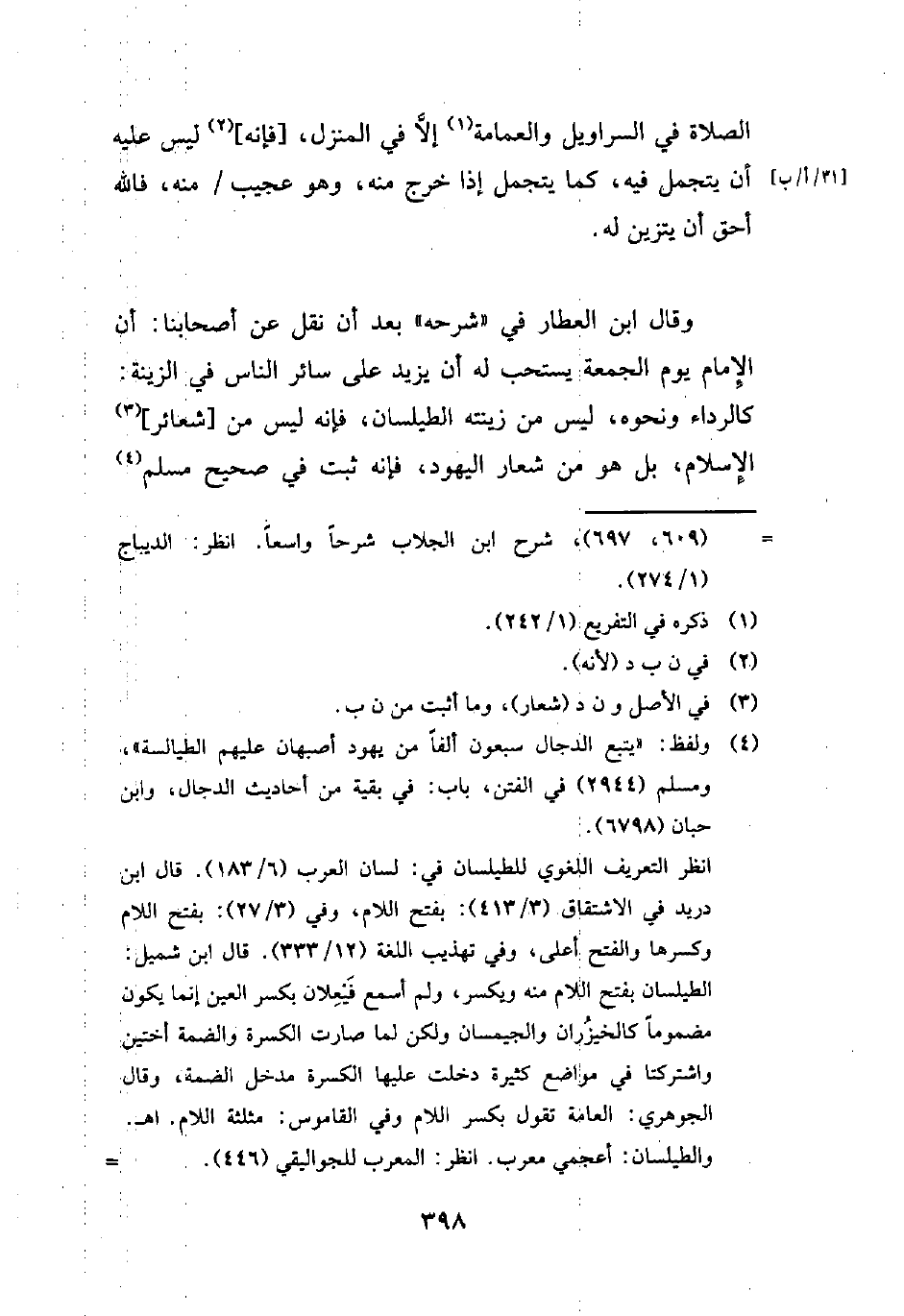 وقال ابن العطار في "شرحه" بعد أن نقل عن أصحابنا: أن الإِمام يوم الجمعة يستحب له أن يزيد على سائر الناس في الزينة: كالرداء ونحوه، ليس من زينته الطيلسان، فإنه ليس من [شعائر] (¬3) الإِسلام، بل هو من شعار اليهود، فأنه يثبت في صحيح مسلم (¬4)