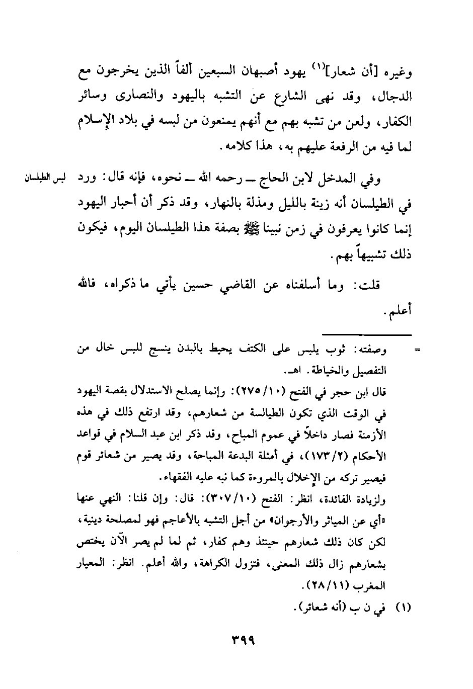 قال ابن حجر في الفتح (10/ 275): وإنما يصلح الاستدلال بقصة اليهود في الوقت الذي تكون الطيالسة من شعارهم، وقد ارتفع ذلك في هذه الأزمنة فصار داخلًا في عموم المباح، وقد ذكر ابن عبد السلام في قواعد الأحكام (2/ 173)، في أمثلة البدعة المباحة، وقد يصير من شعائر قوم فيصير تركه من الإِخلال بالمروءة كما نبه عليه الفقهاء.