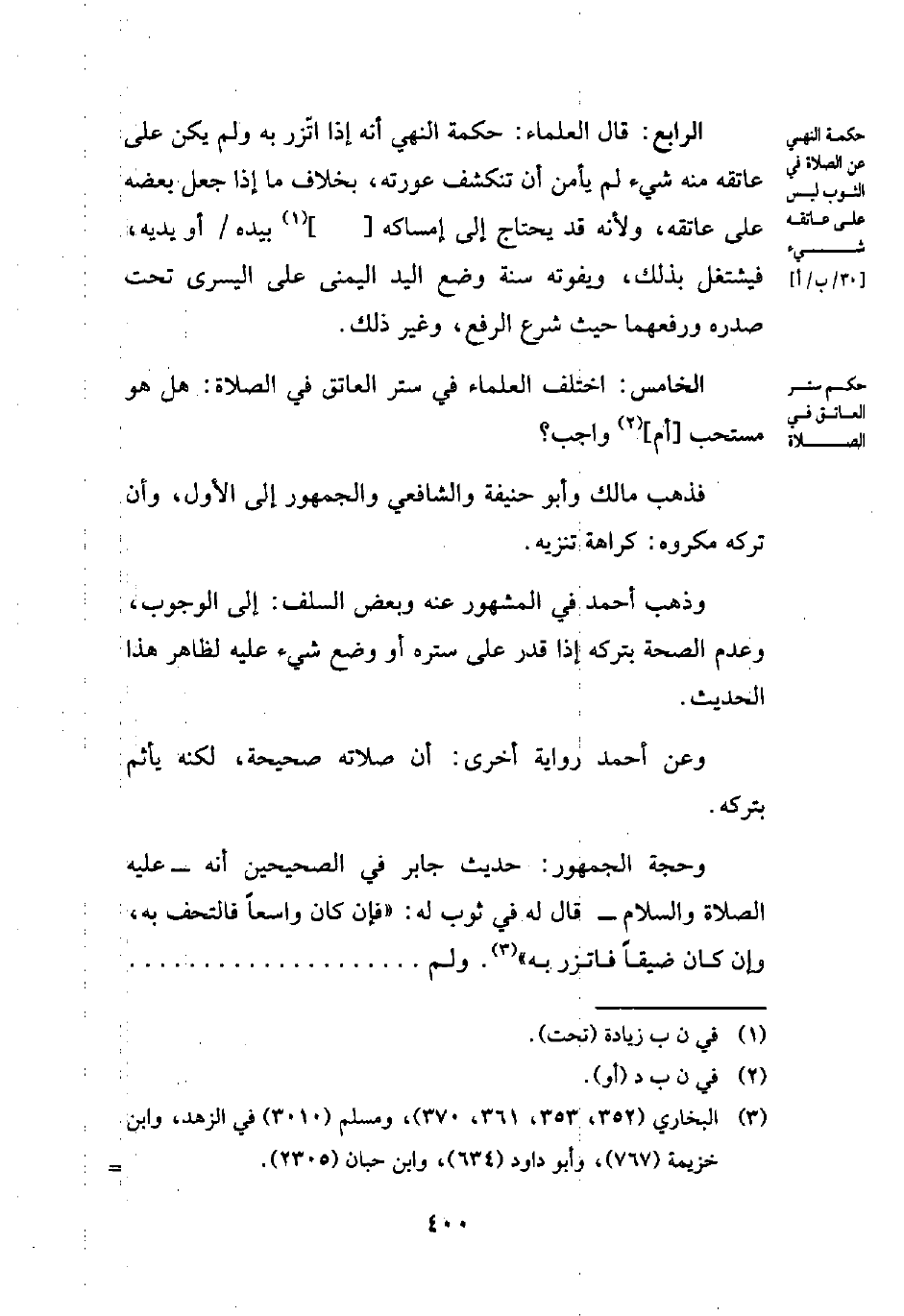الخامس: اختلف العلماء في ستر العاتق في الصلاة: هل هو مستحب [أم] (¬2) واجب؟