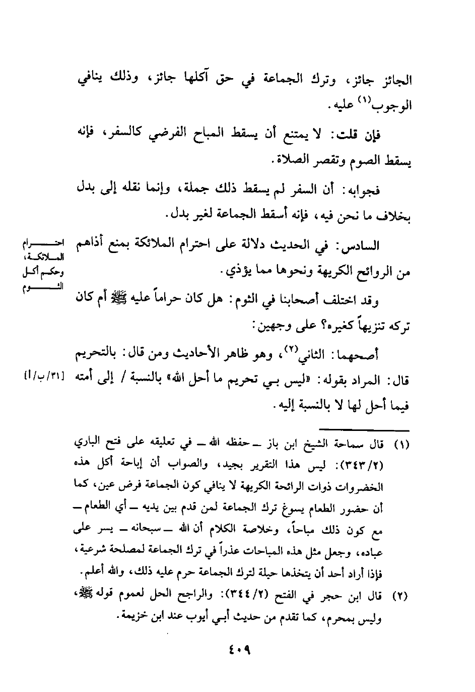 (¬1) قال سماحة الشيخ ابن باز -حفظه الله- في تعليقه على فتح الباري (2/ 343): ليس هذا التقرير بجيد، والصواب أن إباحة أكل هذه الخضروات ذوات الرائحة الكريهة لا ينافي كون الجماعة فرض عين، كما أن حضور الطعام يسوغ ترك الجماعة لمن قدم بين يديه -أي الطعام- مع كون ذلك مباحًا، وخلاصة الكلام أن الله -سبحانه- يسر على عباده، وجعل مثل هذه المباحات عذرًا في ترك الجماعة لمصلحة شرعية، فإذا أراد أحد أن يتخذها حيلة لترك الجماعة حرم عليه ذلك، والله أعلم.