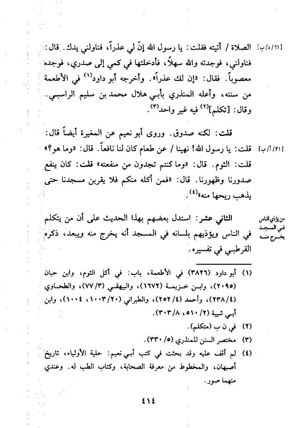 (¬1) أبو داود (3826) في الأطعمة، باب: في أكل الثوم، وابن حبان (2095)، وابن خزيمة (1672)، والبيهقي (3/ 77)، والطحاوي (4/ 238)، وأحمد (4/ 252)، ر الطبراني (20/ 1003، 1004)، وابن أبي شيبة (2/ 510، 8/ 303).