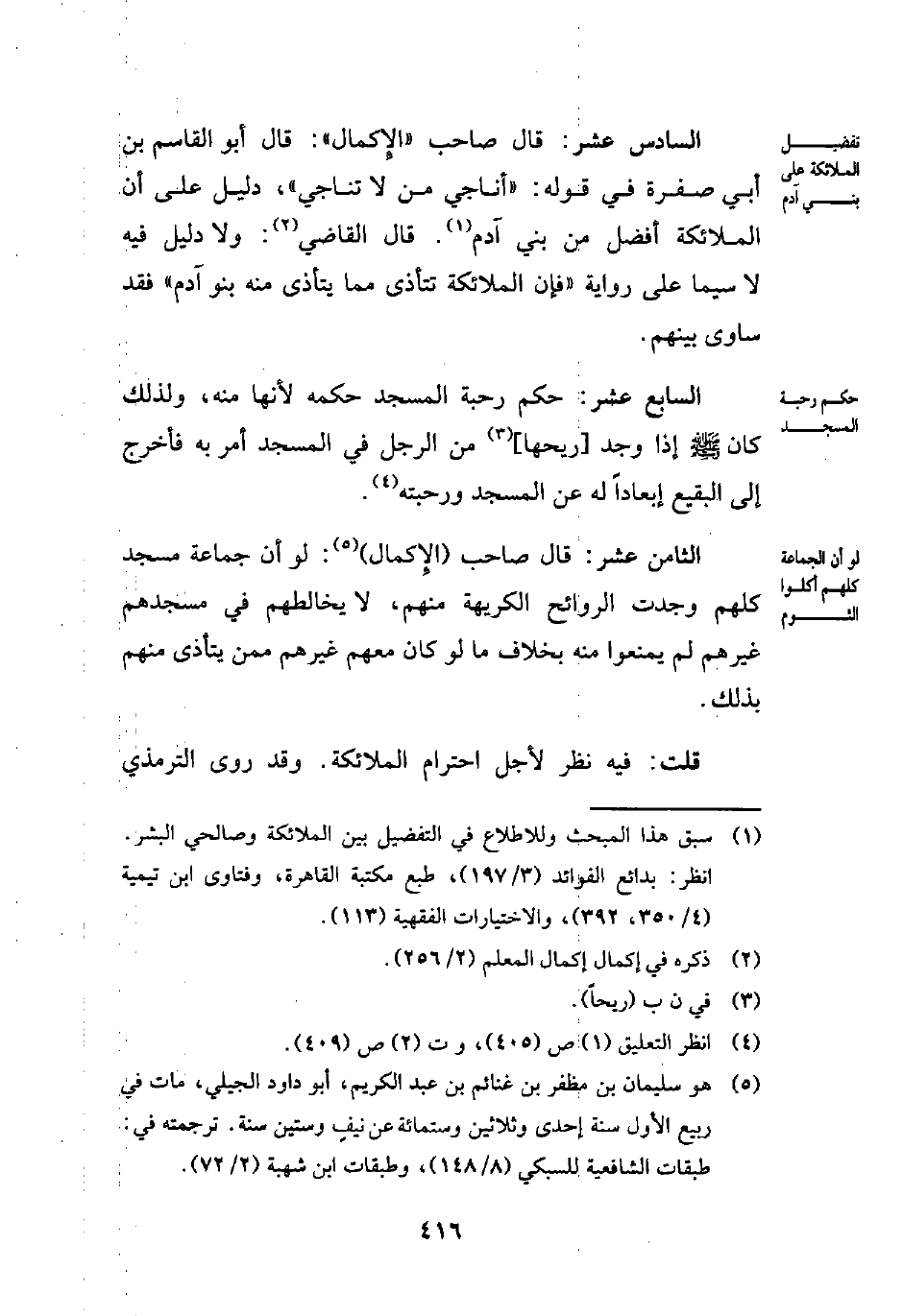 السادس عشر: قال صاحب "الإِكمال": قال أبو القاسم بن أبي صفرة في قوله: "أناجي من لا تناجي"، دليل على أن الملائكة أفضل من بني آدم (¬1). قال القاضي (¬2): ولا دليل فيه لا سيما على رواية "فإن الملائكة تتأذى مما يتأذى منه بنو آدم" فقد ساوى بينهم.