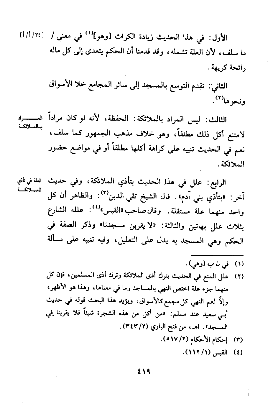 (¬2) علل المنع في الحديث بترك أذى الملائكة وترك أذى المسلمين، فإن كل منهما جزء علة اختص النهي بالمساجد وما في معناها، وهذا هو الأظهر، وإلَّا لعم النهي كل مجمع كالأسراق، ويؤيد هذا البحث قوله في حديث أبي سعيد عند مسلم: "من أكل من هذه الشجرة شيئًا فلا يقربنا في المسجد". اهـ، من فتح الباري (2/ 343).