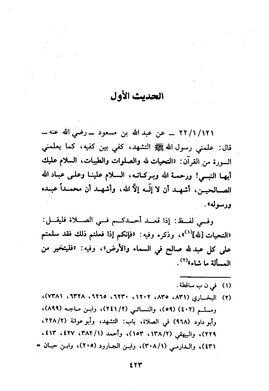 (¬2) البخاري (831، 835، 1202، 6230، 6265، 6328، 7381)، ومسلم (402) (59)، والنسائي (2/ 241)، وابن ماجه (899)، وأبو داود (968) في الصلاة، باب: التشهد، وأبو عوانة (2/ 228، 229)، والبيهقي (2/ 138، 153)، وأحمد (1/ 382، 427، 413، 431)، والدارمي (1/ 308)، وابن الجارود (205)، وابن حبان =