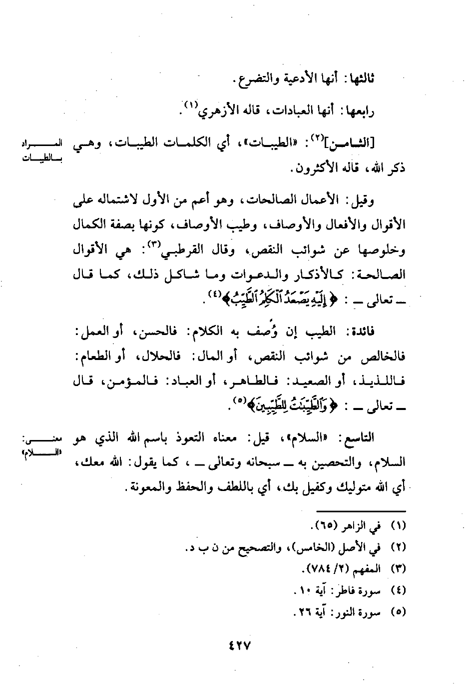 وقيل: الأعمال الصالحات، وهو أعم من الأول لاشتماله على الأقوال والأفعال والأوصاف، وطيب الأوصاف، كونها بصفة الكمال وخلوصها عن شوائب النقص، وقال القرطبي (¬3): هي الأقوال الصالحة: كالأذكار والدعوات وما شاكل ذلك، كما قال -تعالى-: {إِلَيْهِ يَصْعَدُ الْكَلِمُ الطَّيِّبُ} (¬4).