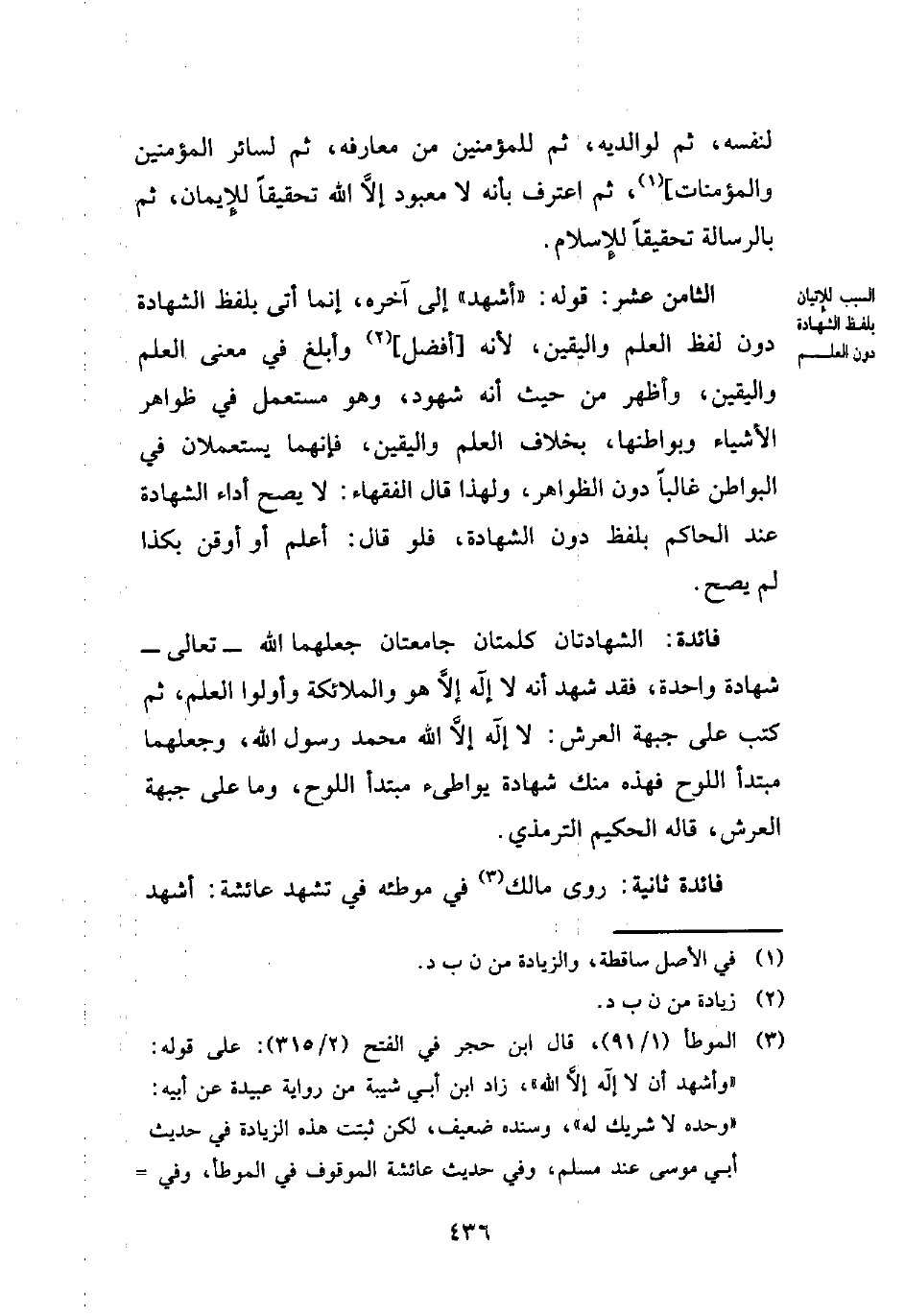 (¬3) الموطأ (1/ 91)، قال ابن حجر في الفتح (2/ 315): على قوله: "وأشهد أن لا إله إلَّا الله"، زاد ابن أبي شيبة من رواية عبيدة عن أبيه: "وحده لا شريك له"، وسنده ضعيف، لكن ثبتت هذه الزيادة في حديث أبي موسى عند مسلم، وفي حديث عائشة الموقوف في الموطأ، وفي =