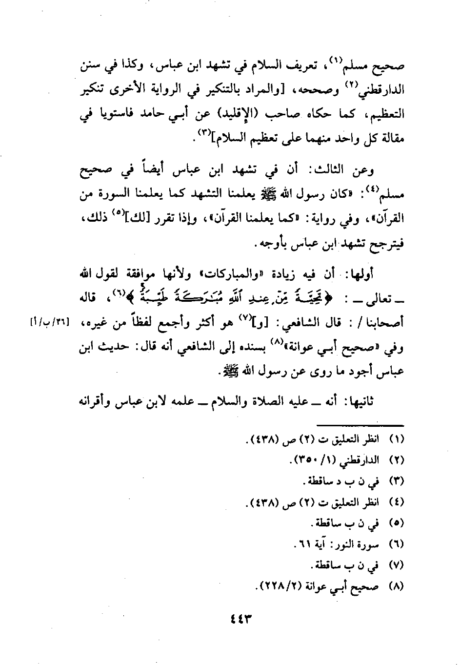 صحيح مسلم (¬1)، تعريف السلام في تشهد ابن عباس، وكذا في سنن الدارقطني (¬2) وصححه، أو المراد بالتنكير في الرواية الأخرى تنكير التعظيم، كما حكاه صاحب (الإِقليد) عن أبي حامد فاستويا في مقالة كل واحد منهما على تعظيم السلام] (¬3).