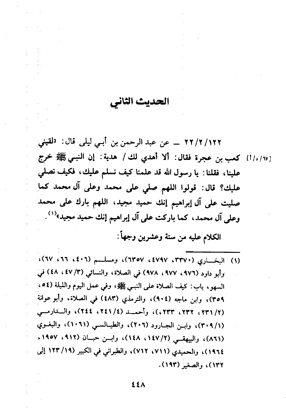 122/ 2/ 22 - عن عبد الرحمن بن أبي ليلى قال: "لقيني كعب بن عجرة فقال: ألا أهدي لك هدية: إن النبي - صلى الله عليه وسلم - خرج علينا، فقلنا: يا رسول الله قد علمنا كيف نسلم عليك، فكيف نصلي عليك؟ قال: قولوا اللهم صلي على محمد وعلى آل محمد كما صليت على آل إبراهيم إنك حميد مجيد، اللهم بارك على محمد وعلى آل محمد، كما باركت على آل إبراهيم إنك حميد مجيد" (¬1).