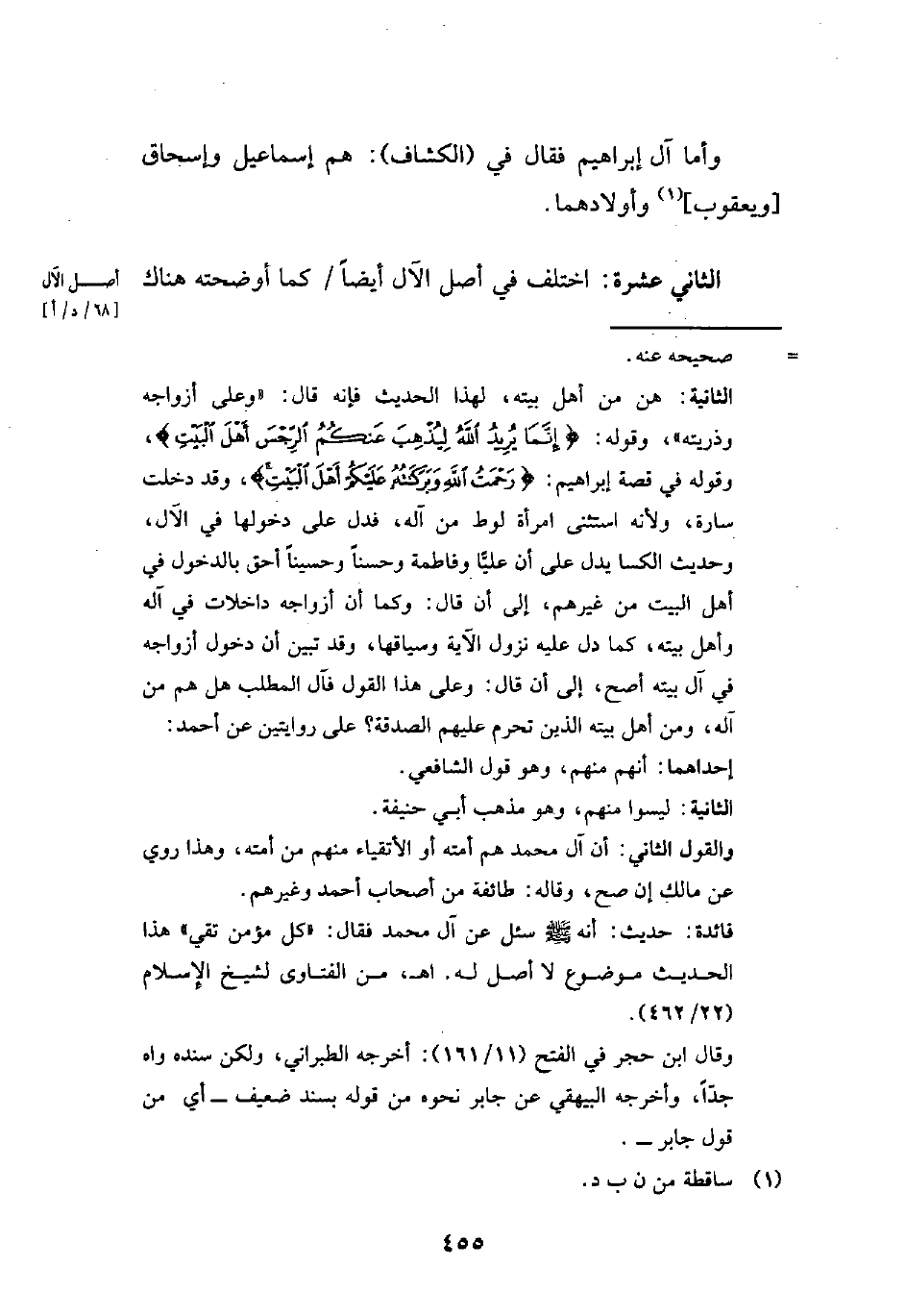 وقوله في قصة إبراهم: {رَحْمَتُ اللَّهِ وَبَرَكَاتُهُ عَلَيْكُمْ أَهْلَ الْبَيْتِ}، وقد دخلت سارة، ولأنه استثنى امرأة لوط من آله، فدل على دخولها في الآل، وحديث الكسا يدل على أن عليًّا وفاطمة وحسنًا وحسينًا أحق بالدخول في أهل البيت من غيرهم، إلى أن قال: وكما أن أزواجه داخلات في آله وأهل بيته، كما دل عليه نزول الآية وسياقها، وقد تبين أن دخول أزواجه في آل بيته أصح، إلى أن قال: وعلى هذا القول فآل المطلب هل هم من آله، ومن أهل بيته الذين تحرم عليهم الصدقة؟ على روايتين عن أحمد: إحداهما: أنهم منهم، وهو قول الشافعي.