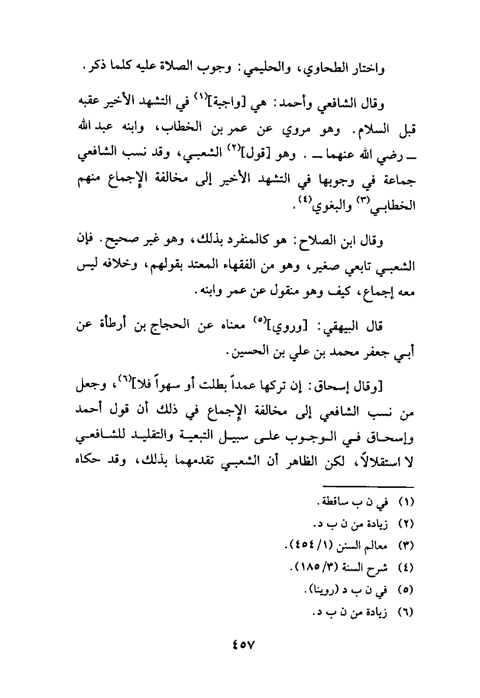 وقال الشافعي وأحمد: هي [واجبة] (¬1) في التشهد الأخير عقبه قبل السلام. وهو مروي عن عمر بن الخطاب، وابنه عبد الله - رضي الله عنهما -. وهو [قول] (¬2) الشعبي، وقد نسب الشافعي جماعة في وجوبها في التشهد الأخير إلى مخالفة الإِجماع منهم