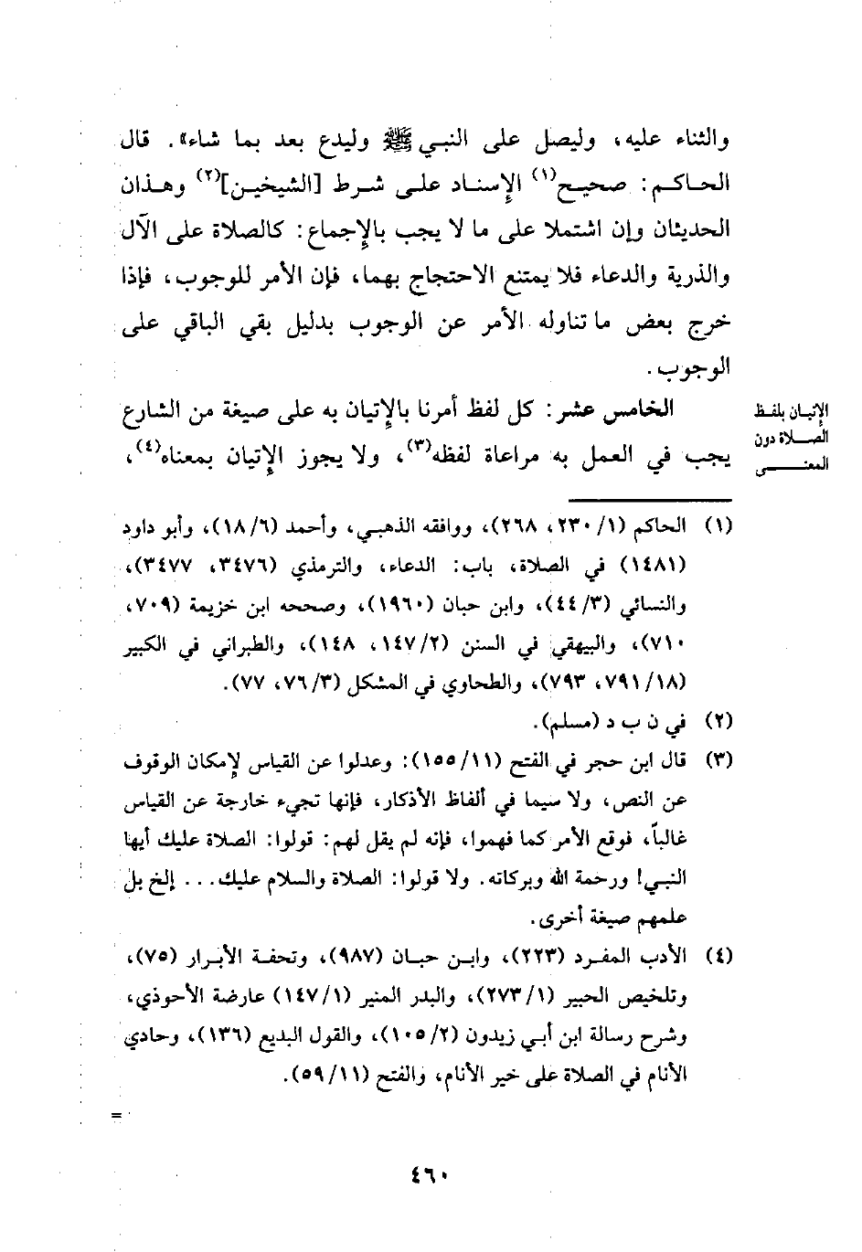 (¬3) قال ابن حجر في الفتح (11/ 155): وعدلوا عن القياس لإِمكان الوقوف عن النص، ولا سيما في ألفاظ الأذكار، فإنها تجيء خارجة عن القياس غالبًا، فوقع الأصل كما فهموا، فإنه لم يقل لهم: قولوا: الصلاة عليك أيها النبي! ورحمة الله وبركاته. ولا قولوا: الصلاة والسلام عليك ... إلخ بل علمهم صيغة أخرى.