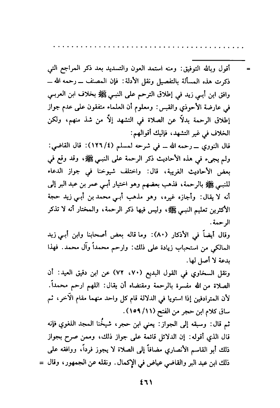 = أقول وبالله التوفيق: ومنه استمد العون والتسديد بعد ذكر المراجع التي ذكرت هذه المسألة بالتفصيل ونقل الأدلة: فإن المصنف -رحمه الله- وافق ابن أبي زيد في إطلاق الترحم على النبي - صلى الله عليه وسلم - بخلاف ابن العربي في عارضة الأحوذي والقبس: ومعلوم أن العلماء متفقون على عدم جواز إطلاق الرحمة بدلًا عن الصلاة في التشهد إلَّا من شذ منهم، ولكن الخلاف في غير التشهد، فإليك أقوالهم: