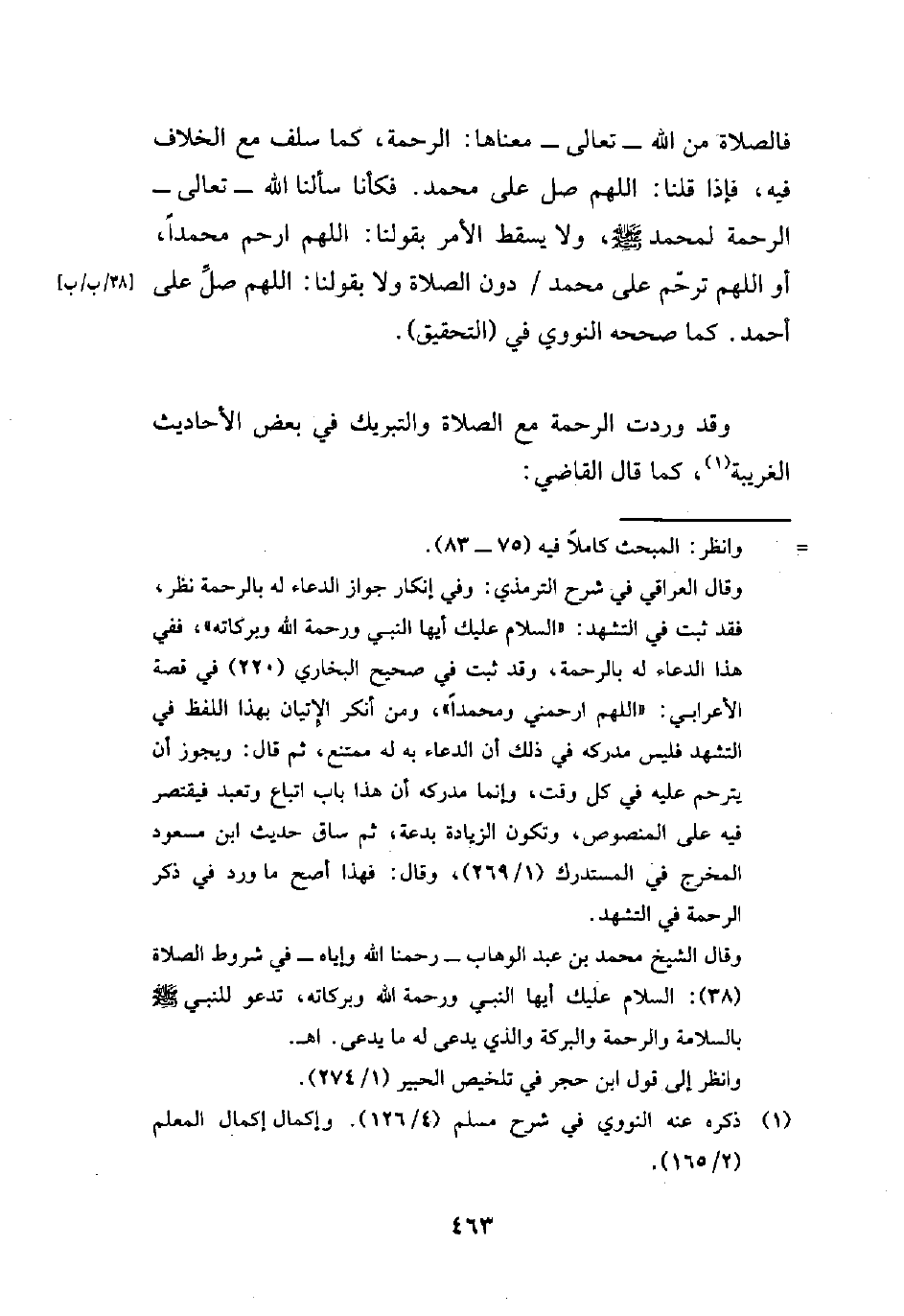 وقال العراقي في شرح الترمذي: وفي إنكار جواز الدعاء له بالرحمة نظر، فقد ثبت في التشهد: "السلام عيك أيها النبي ورحمة الله وبركاته"، ففي هذا الدعاء له بالرحمة، وقد ثبت في صحيح البخاري (220) في قصة الأعرابي: "اللهم ارحمني ومحمدًا"، ومن أنكر الإِتيان بهذا اللفظ في التشهد فليس مدركه في ذلك أن الدعاء به له ممتنع، ثم قال: ويجوز أن يترحم عليه في كل وقت، وإنما مستدركه أن هذا باب اتباع وتعبد فيقتصر فيه على المنصوص، وتكون الزيادة بدعة، ثم ساق حديث ابن مسعود المخرج في المستدرك (1/ 269)، وقال: فهذا أصح ما ورد في ذكر الرحمة في التشهد.