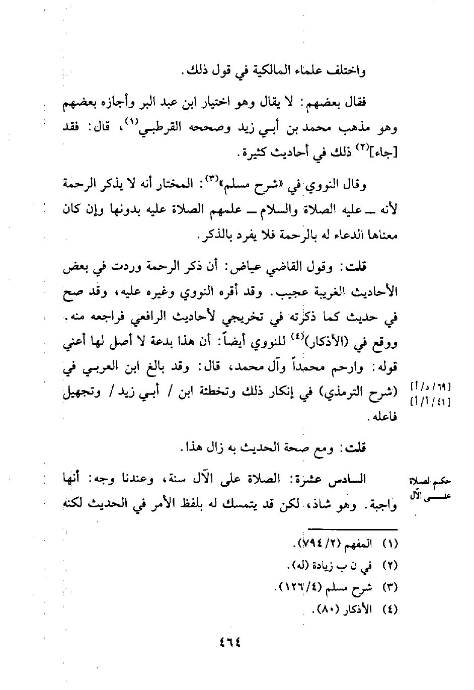 في حديث كما ذكرته في تخريجي لأحاديث الرافعي فراجعه منه. ووقع في (الأذكار) (¬4) للنووي أيضًا: أن هذا بدعة لا أصل لها أعني قوله: وارحم محمدًا وآل محمد، قال: وقد بالغ ابن العربي في (شرح الترمذي) في إنكار ذلك وتخطئة ابن أبي زيد وتجهيل فاعله.
