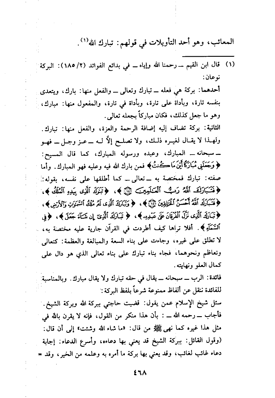 فائدة: الرب -سبحانه- يقال في حقه تبارك ولا يقال مبارك. وبالمناسبة للفائدة ننقل عن ألفاظ ممنوعة شرعًا بلفظ البركة: