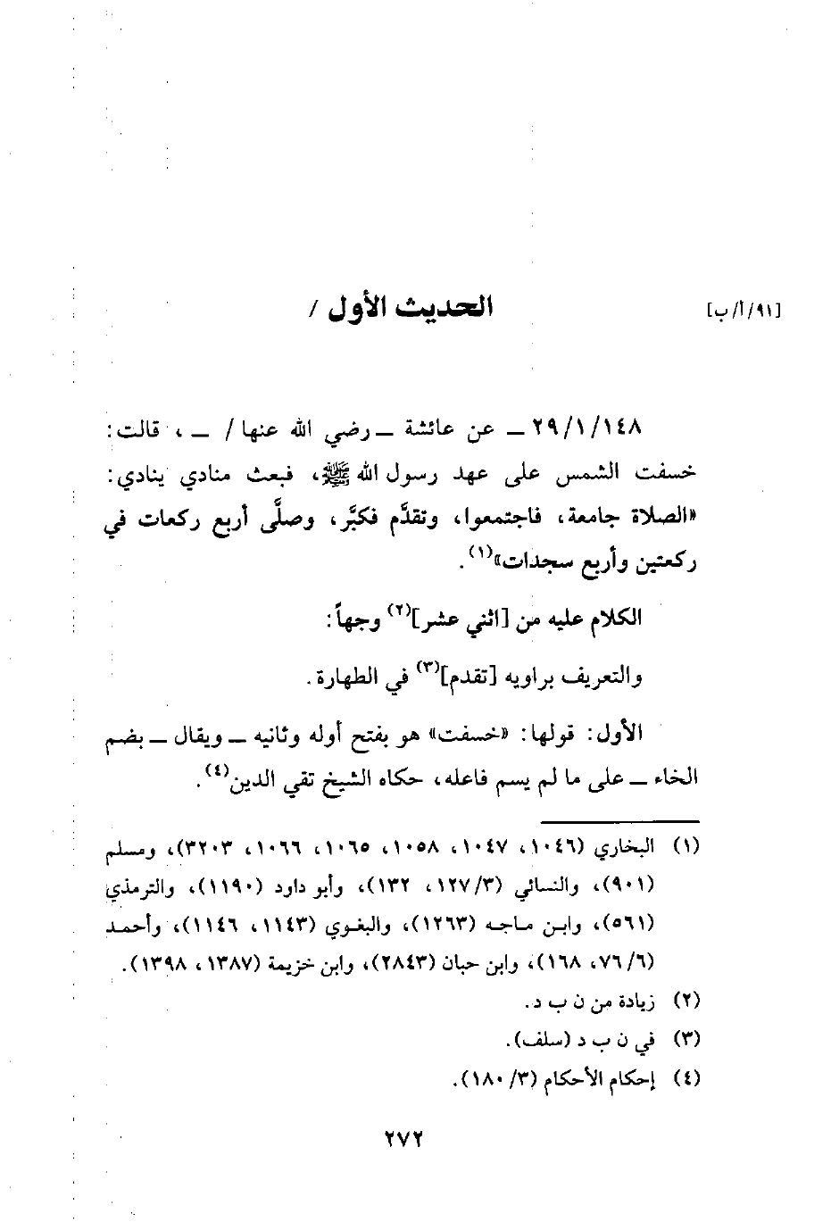 148/ 1/ 29 - عن عائشة - رضي الله عنها -، قالت: خسفت الشمس على عهد رسول الله - صلى الله عليه وسلم -، فبعث منادي ينادي: "الصلاة جامعة، فاجتمعوا، وتقدَّم فكبَّر، وصلى أربع ركعات في ركعتين وأربع سجدات" (¬1).