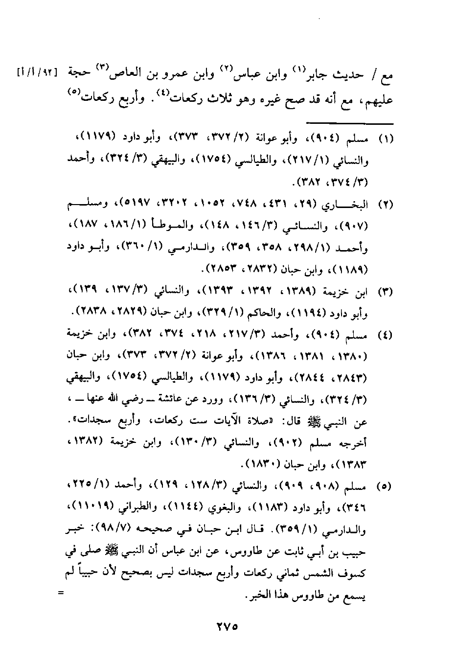 (¬5) مسلم (908، 909)، والنسائي (3/ 128، 129)، وأحمد (1/ 225، 346)، وأبو داود (1183)، والبغوي (1144)، والطبراني (11019)، والدارمي (1/ 359). قال ابن حبان في صحيحه (98/ 7): خبر حبيب بن أبي ثابت عن طاووس، عن ابن عباس أن النبي - صلى الله عليه وسلم - صلَّى في كسوف الشمس ثماني ركعات وأربع سجدات ليس بصحيح لأن حبيبًا لم يسمع من طاووس هذا الخبر. =