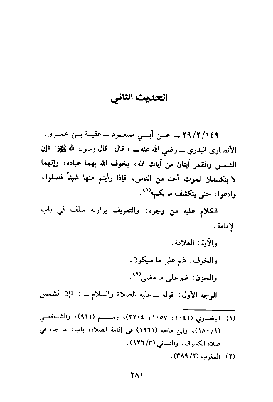 149/ 2/ 29 - عن أبي مسعود -عقبة بن عمرو- الأنصاري البدري - رضي الله عنه -، قال: قال رسول الله - صلى الله عليه وسلم -: "إن الشمس والقمر آيتان من آيات الله، يخوف الله بهما عباده، وإنهما لا ينكسفان لموت أحد من الناس، فإذا رأيتم منها شيئًا فصلوا، وادعوا، حتى ينكشف ما بكم" (¬1).