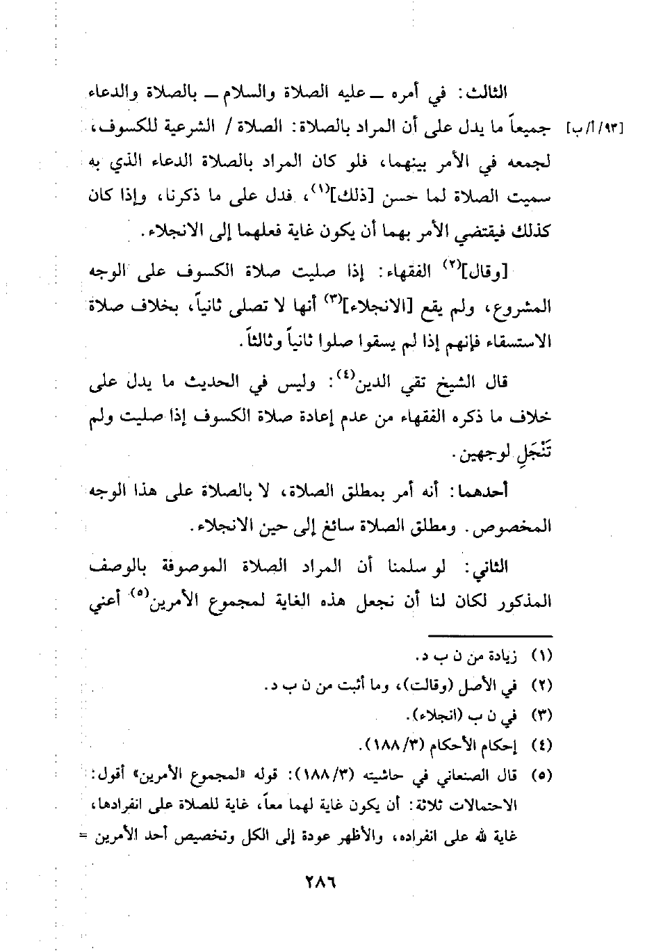 (¬5) قال الصنعاني في حاشيته (3/ 188): قوله "لمجموع الأمرين" أقول: الاحتمالات ثلاثة: أن يكون غاية لهما معًا، غاية للصلاة على انفرادها، غاية لله على انفراده، والأظهر عودة إلى الكل وتخصيص أحد الأمرين =