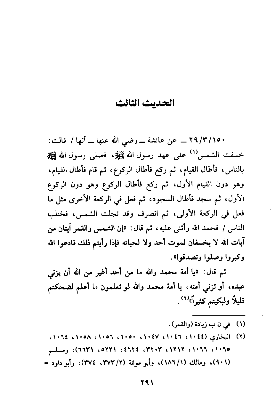 150/ 3/ 29 - عن عائشة - رضي الله عنها - أنها قالت: خسفت الشمس (¬1) على عهد رسول الله - صلى الله عليه وسلم -، فصلى رسول الله - صلى الله عليه وسلم - بالناس، فأطال القيام، ثم ركع فأطال الركوع، ثم قام فأطال القيام، وهو دون القيام الأول، ثم ركع فأطال الركوع وهو دون الركوع الأول، ثم سجد فأطال السجود، ثم فعل في الركعة الأخرى مثل ما فعل في الركعة الأولى، ثم انصرف وقد تجلت الشمس، فخطب الناس فحمد الله وأثنى عليه، ثم قال: "إن الشمس والقمر آيتان من آيات الله لا يخسفان لموت أحد ولا لحياته فإذا رأيتم ذلك فادعوا الله وكبروا وصلوا وتصدقوا".