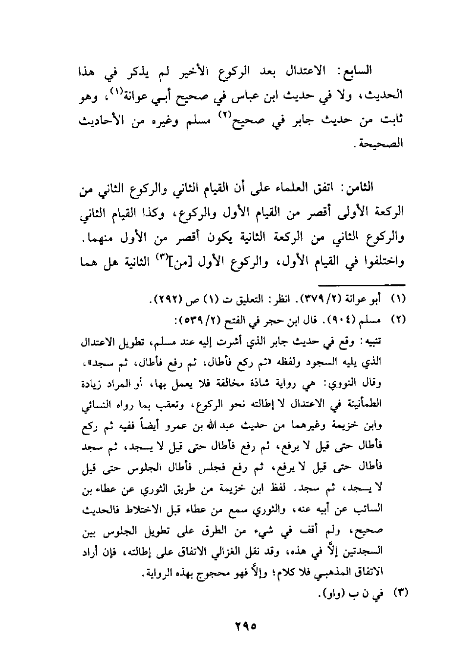تنبيه: وقع في حديث جابر الذي أشرف إليه عند مسلم، تطويل الاعتدال الذي يليه السجود ولفظه "ثم ركع فأطال، ثم رفع فأطال، ثم سجد"، وقال النووي: هي رواية شاذة مخالفة فلا يعمل بها، أو المراد زيادة الطمأنينة في الاعتدال لا إطالته نحو الركوع، وتعقب بما رواه النسائي وابن خزيمة وغيرهما من حديث عبد الله بن عمرو أيضًا ففيه ثم ركع فأطال حتى قيل لا يرفع، ثم رفع فأطال حتى قيل لا يسجد، ثم سجد فأطال حتى قيل لا يرفع، ثم رفع فجلس فأطال الجلوس حتى قيل لا يسجد، ثم سجد. لفظ ابن خزيمة من طريق النووي عن عطاء بن السائب عن أبيه عنه، والثوري سمع من عطاء قبل الاختلاط فالحديث صحيح، ولم أقف في شيء من الطرق على تطويل الجلوس بين السجدتين إلَّا في هذه، وقد نقل الغزالي الاتفاق على إطالته، فإن أراد الاتفاق المذهبي فلا كلام؛ وإلَّا فهو محجوج بهذه الرواية.